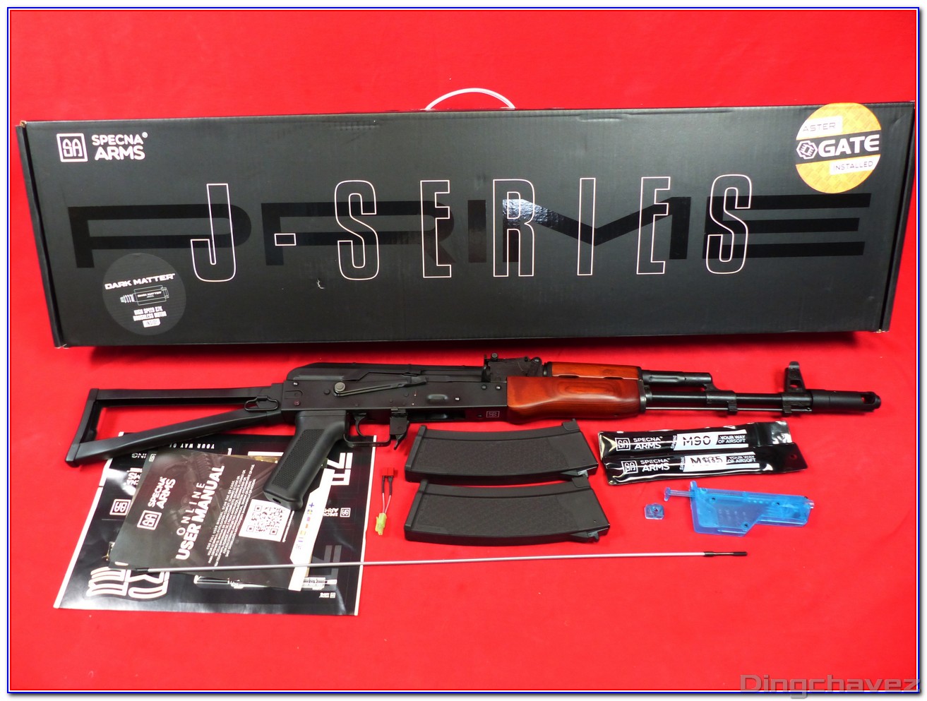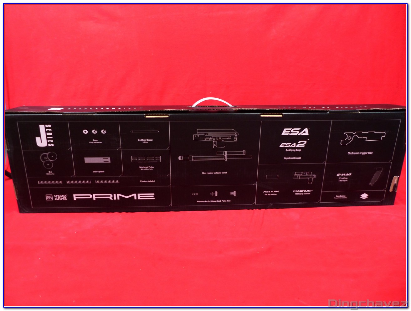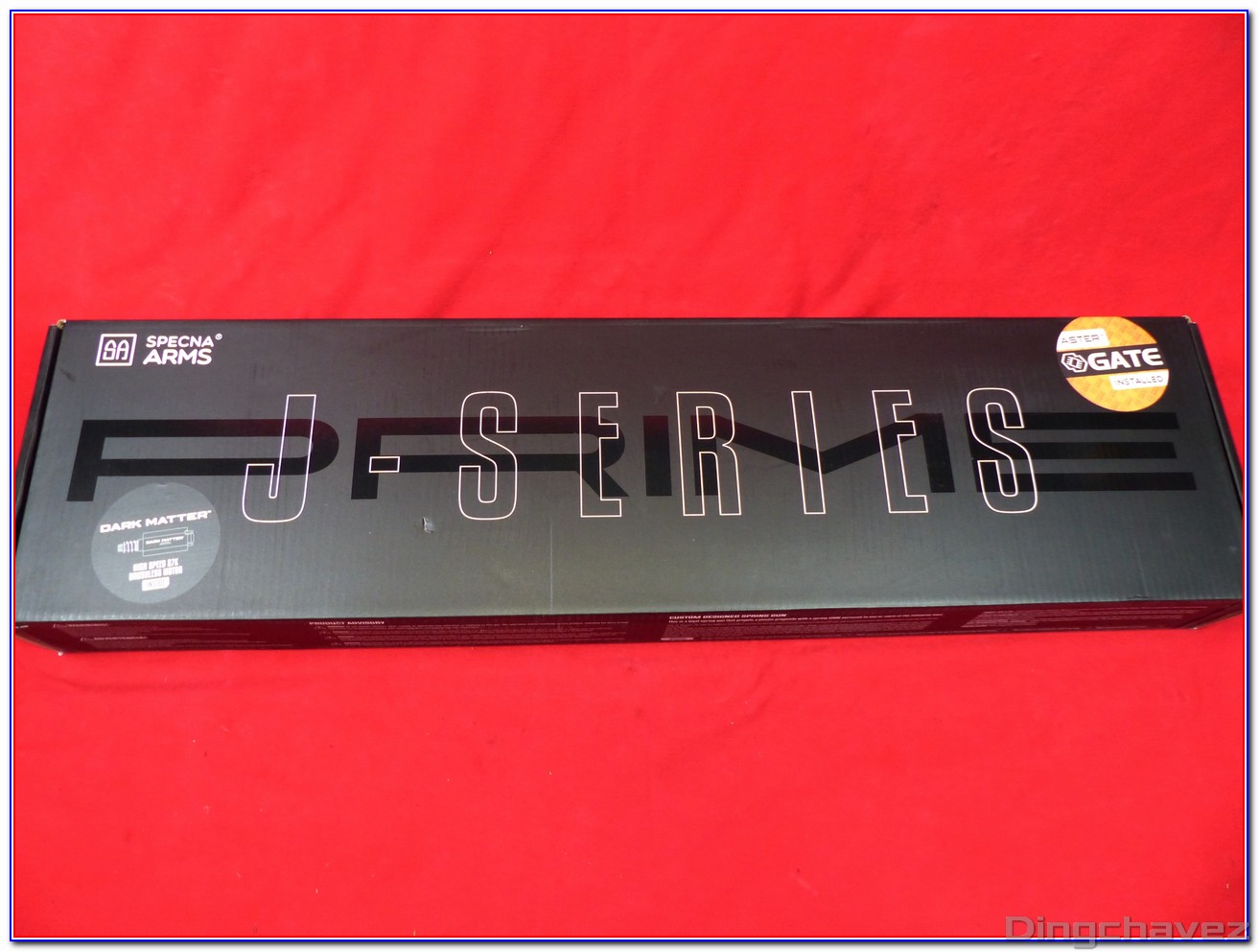 La boite en carton noir reçoit le logo Specna Arms ainsi que la mention « J-SERIES » et PRIME. Des autocollants permettent de savoir qu’il y a un moteur brushless « dark matter » et un ETU Aster de chez GATE à l’intérieur.