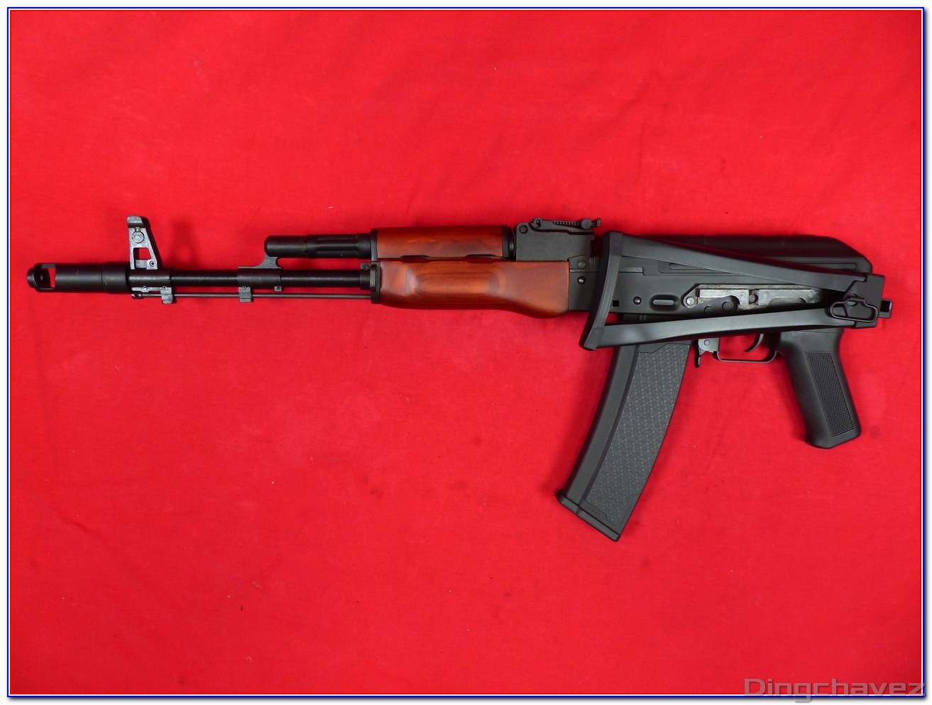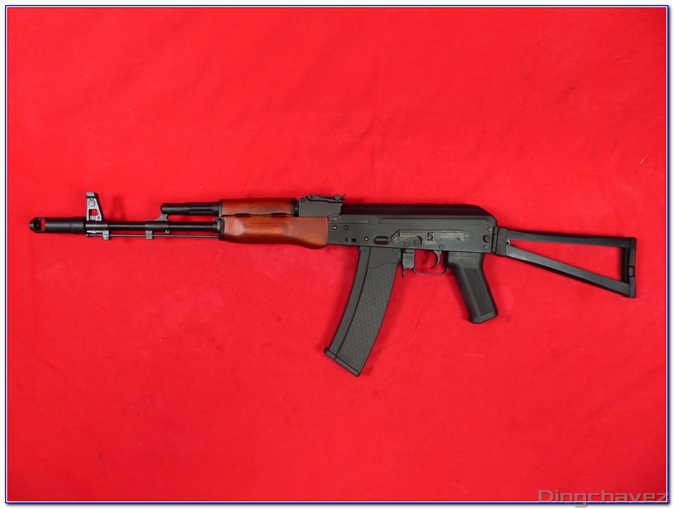 -Le réplique. Ici un AKS-74 composé en grande majorité de métal et d’un peu de bois et de plastique. Elle mesure 950 mm crosse dépliée pour une masse de 3420 grammes.