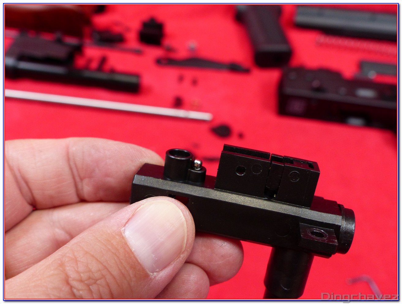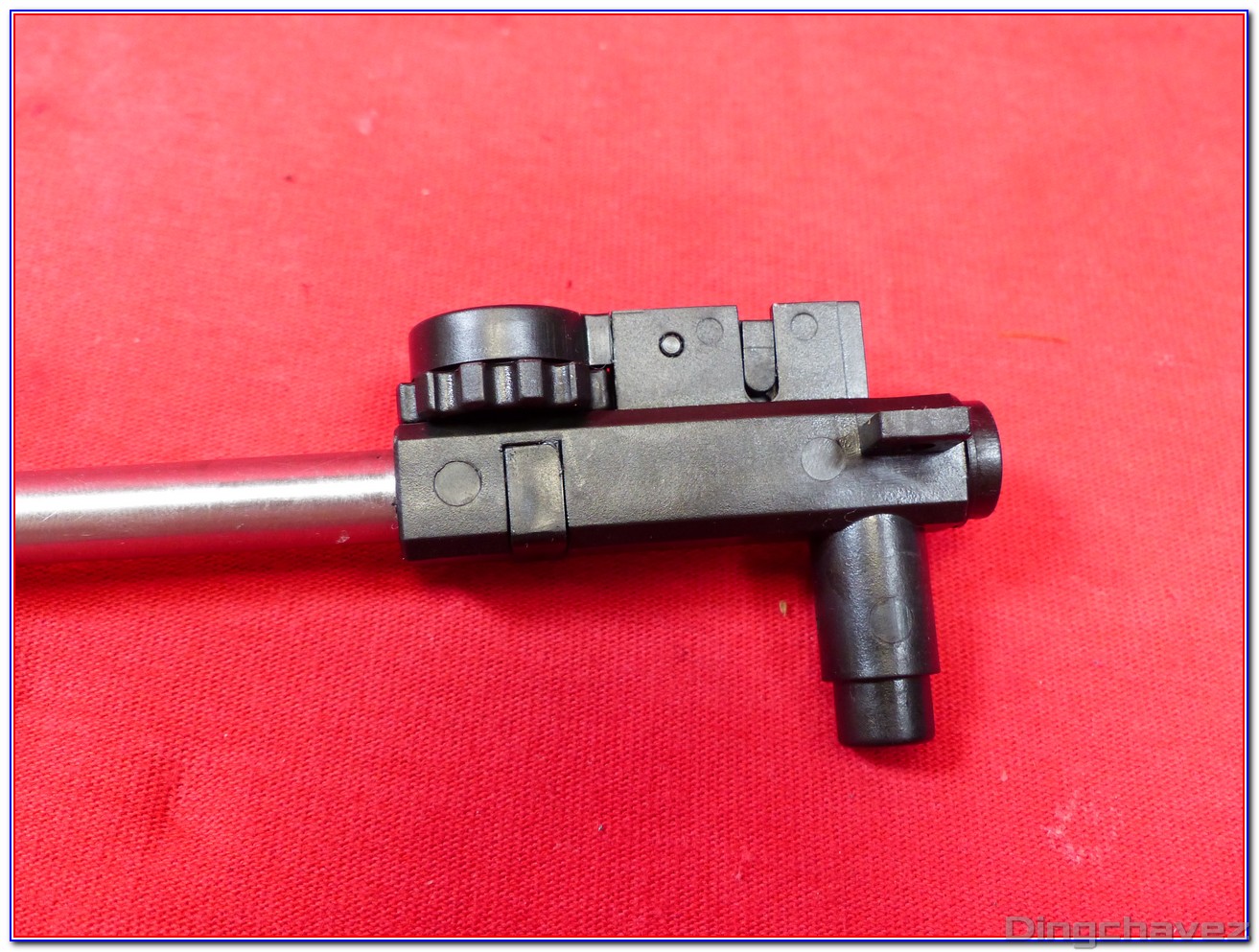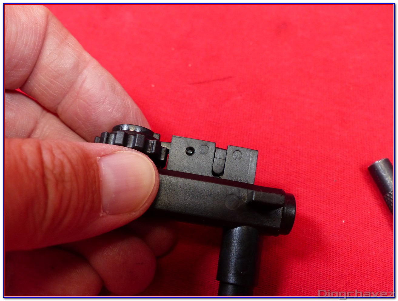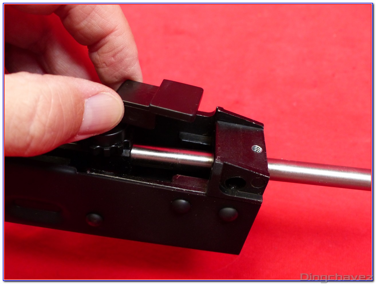 Le faux ensemble mobile (bolt carrier) est en alliage. Pour accéder au réglage du hop-up il est nécessaire de le tirer vers l’arrière et de le maintenir.