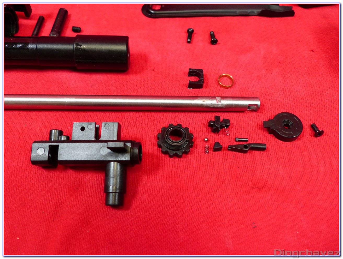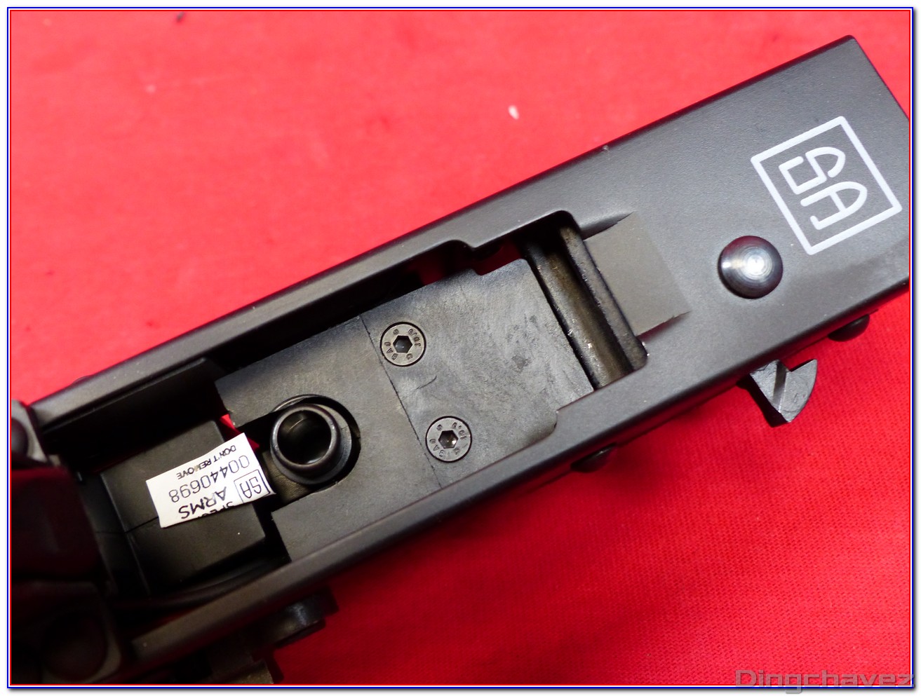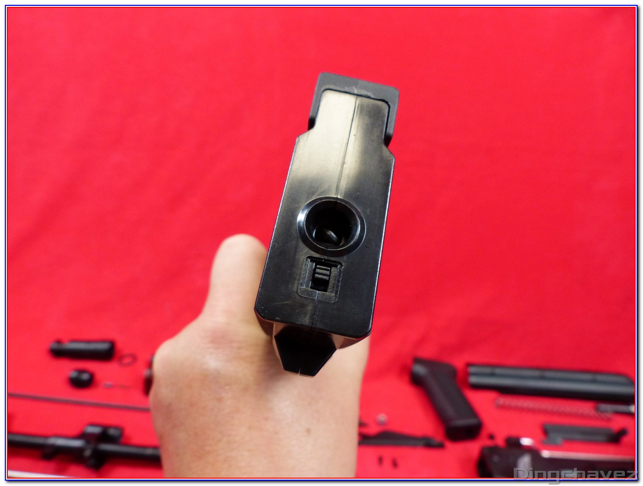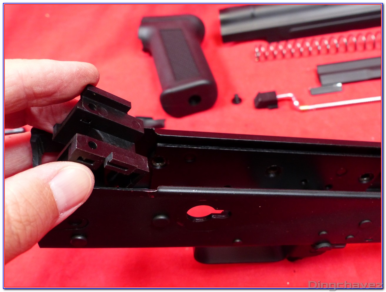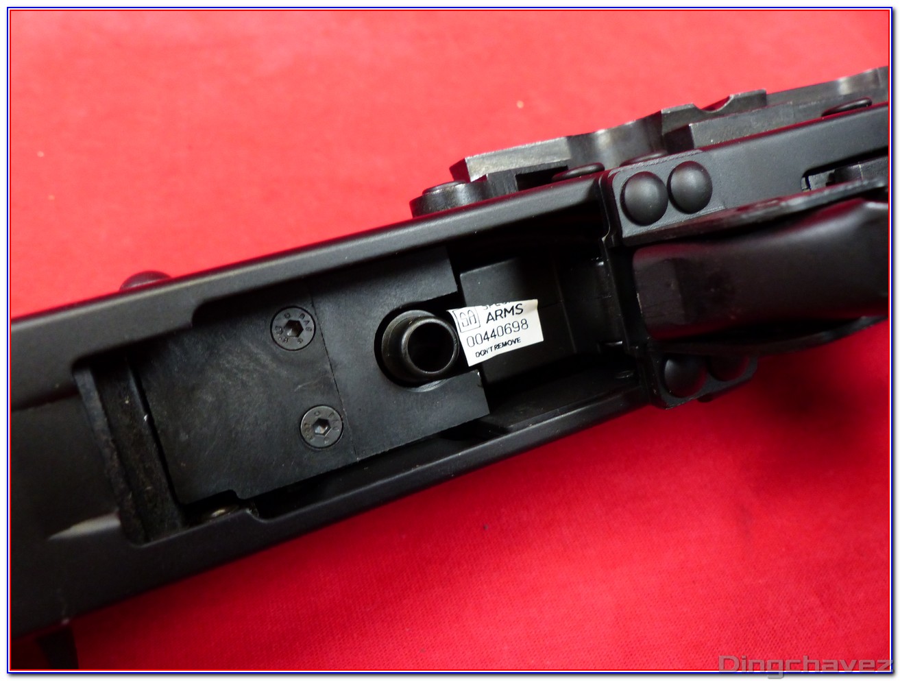 Le faux ensemble mobile (bolt carrier) est en alliage. Pour accéder au réglage du hop-up il est nécessaire de le tirer vers l’arrière et de le maintenir.