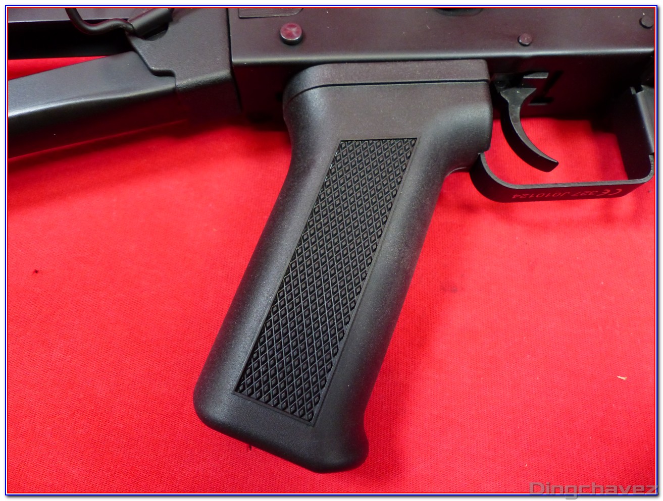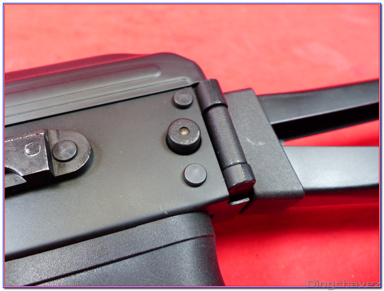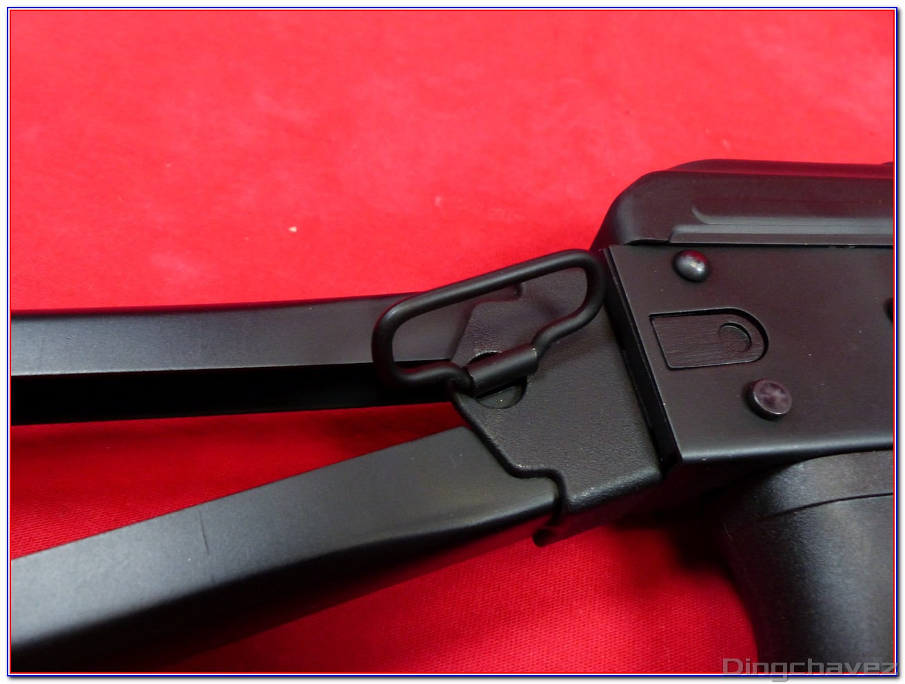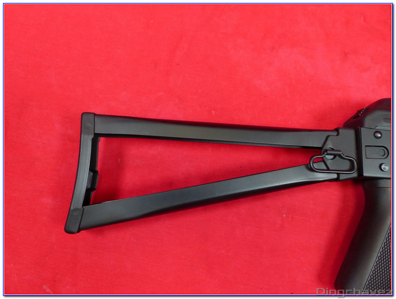 La crosse peut être repliée sur le côté gauche de la réplique. Pour ce faire, il faut appuyer sur un bouton circulaire puis on rabat la crosse jusqu’à la verrouiller sur un petit crochet.