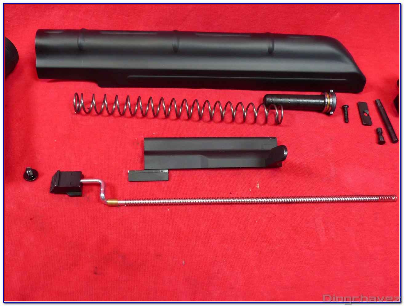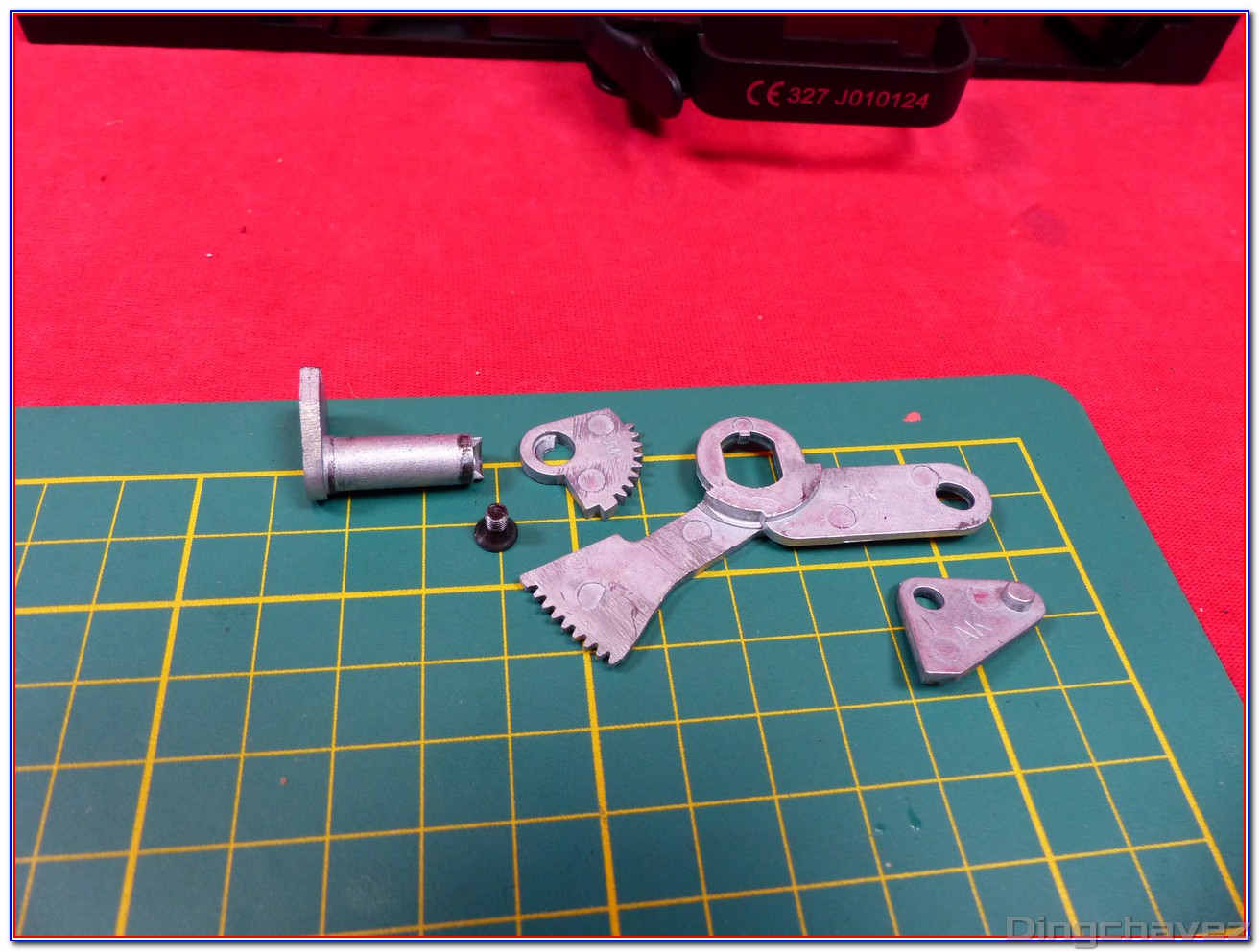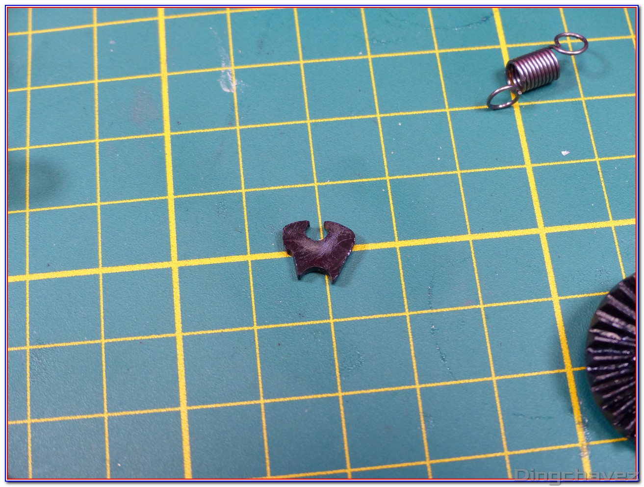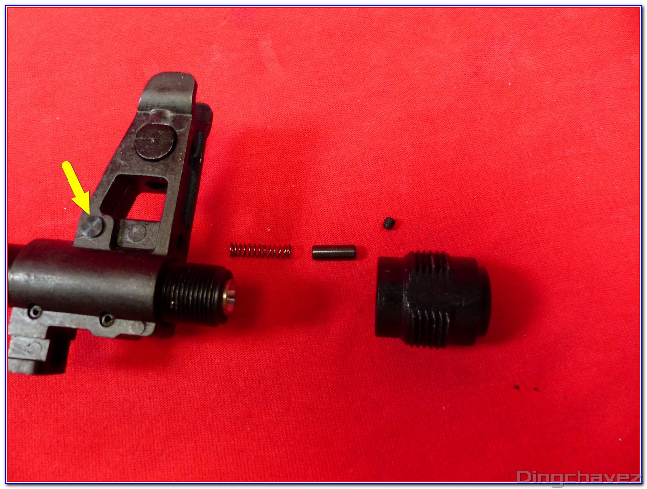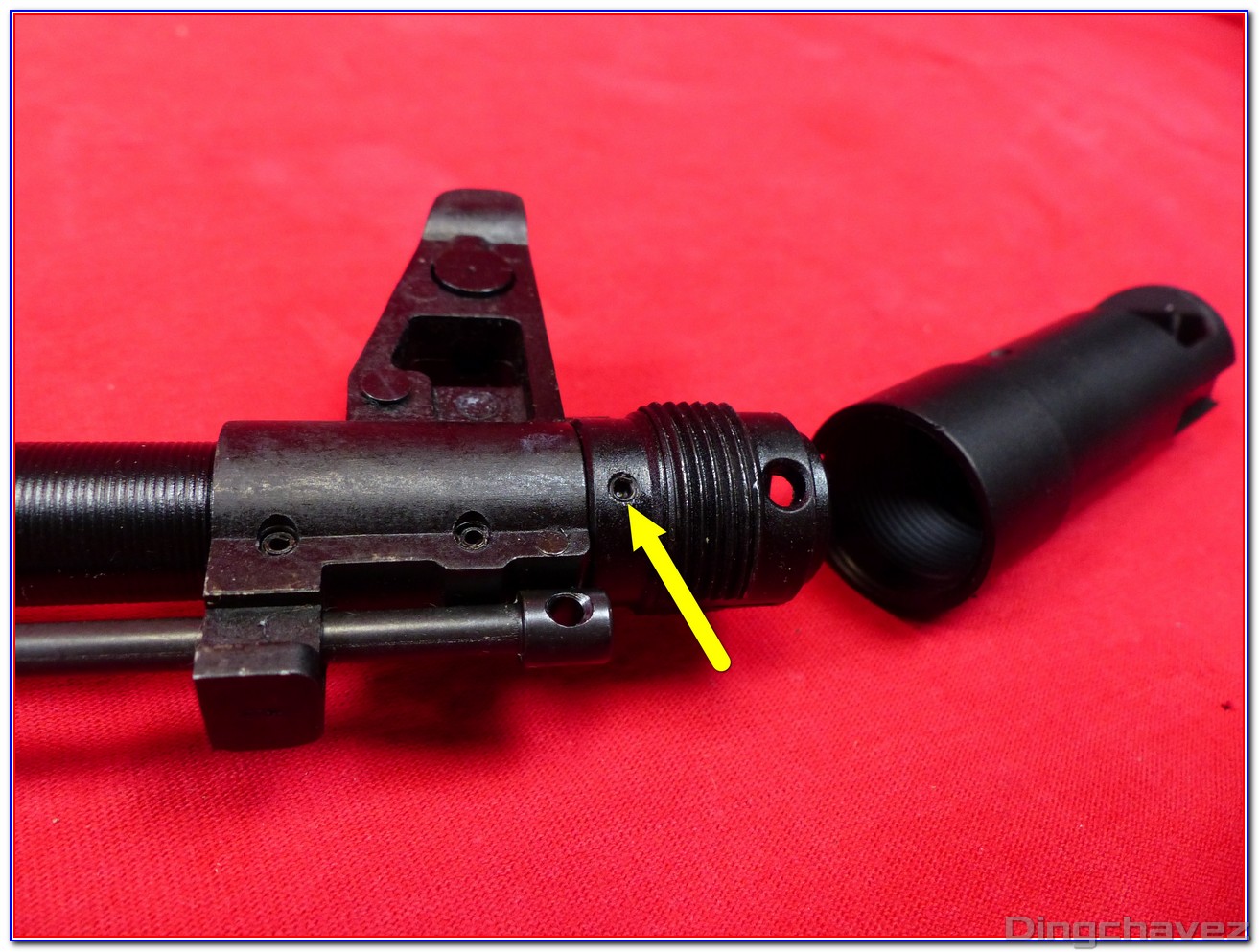 J’ai repéré une pièce avec une flèche jaune, c’est parce qu’elle peut sortir facilement de son emplacement une fois le compensateur déposé. Ne la perdez pas…