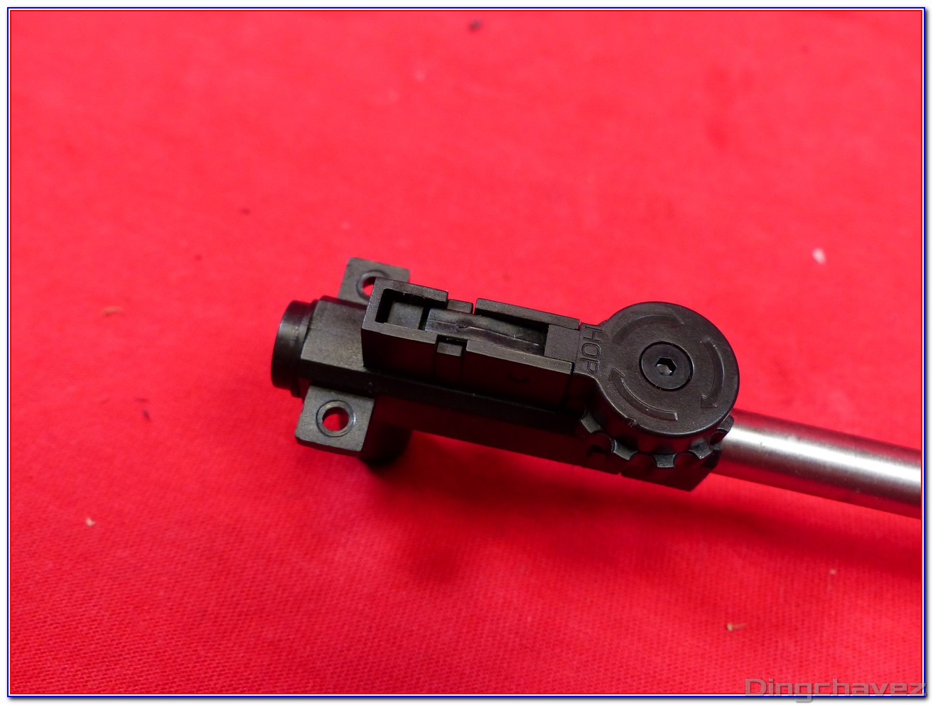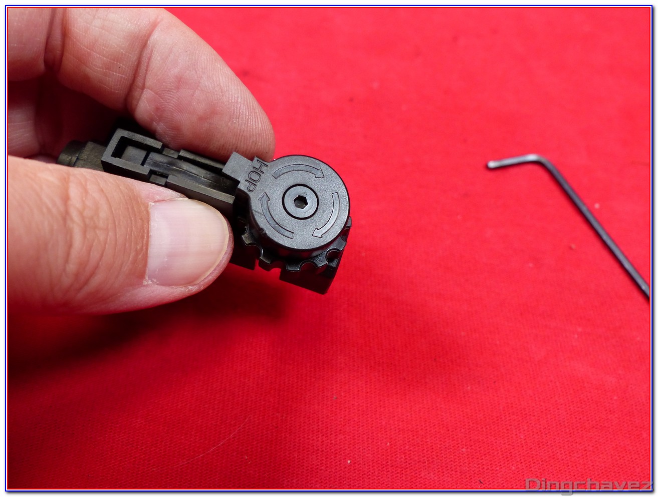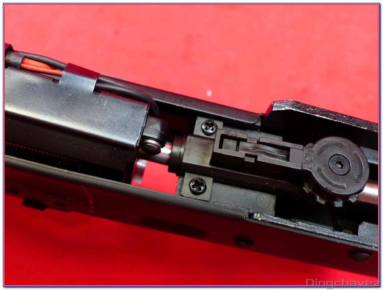 Un capot comportant des flèches indiquant le sens pour augmenter l’effet hop-up coiffe une mollette qui vient appuyer sur un bras qui elle-même actionne un système Top Dead Center (TDC). C’est à dire que l’appui descend bien droit et non pas avec un angle.