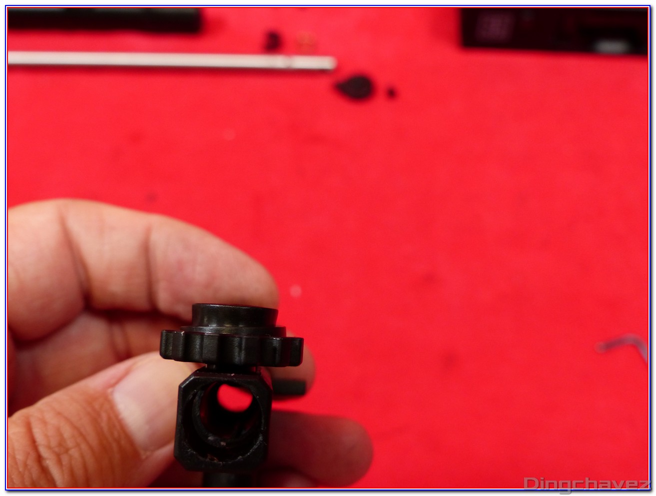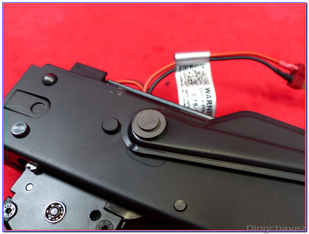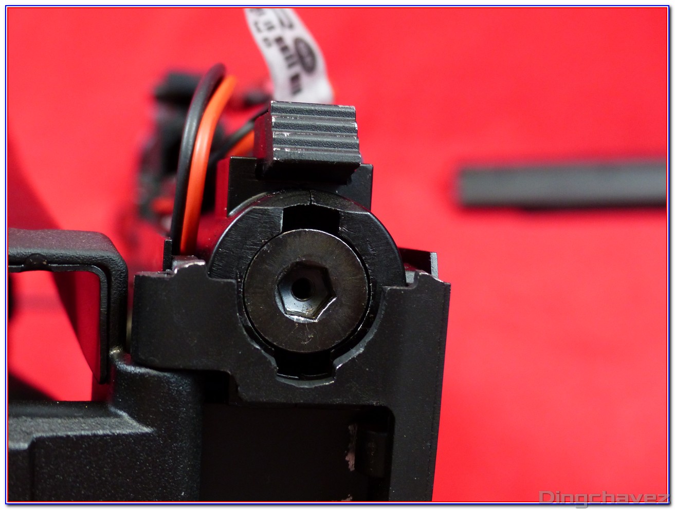Un capot comportant des flèches indiquant le sens pour augmenter l’effet hop-up coiffe une mollette qui vient appuyer sur un bras qui elle-même actionne un système Top Dead Center (TDC). C’est à dire que l’appui descend bien droit et non pas avec un angle.