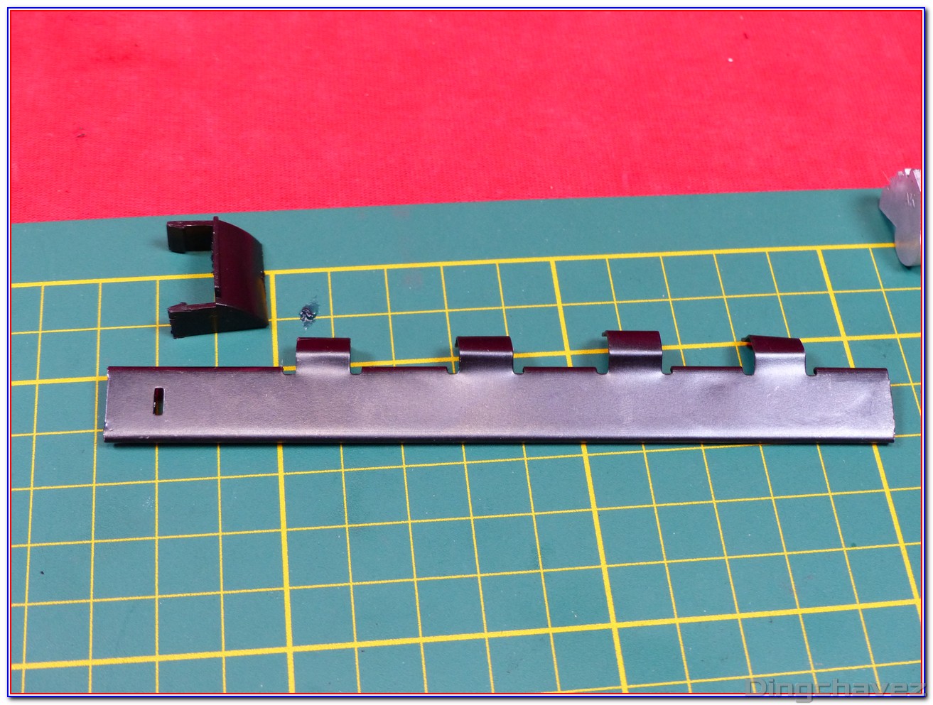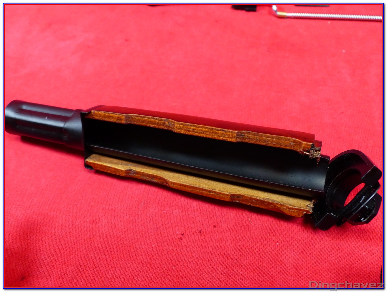 Le garde-main est constitué de deux parties en bois contreplaqué (également appelé parfois « lamellé-collé »). Sa couleur est agréable mais il est un peu terne. J’y ai pour ma part appliqué une couche de vernis chêne clair.