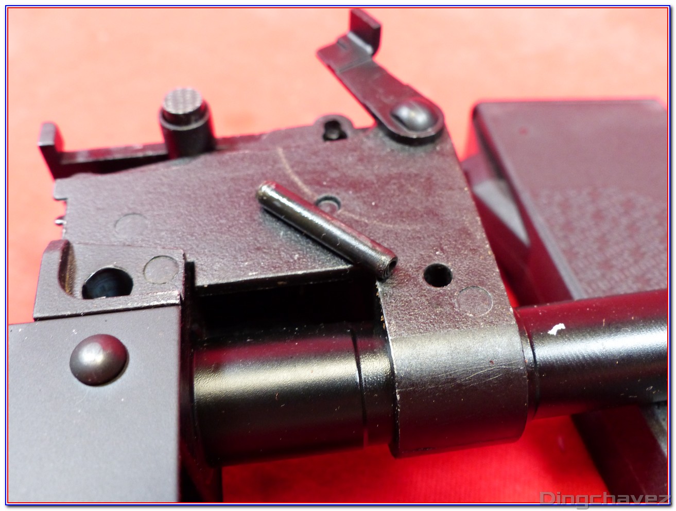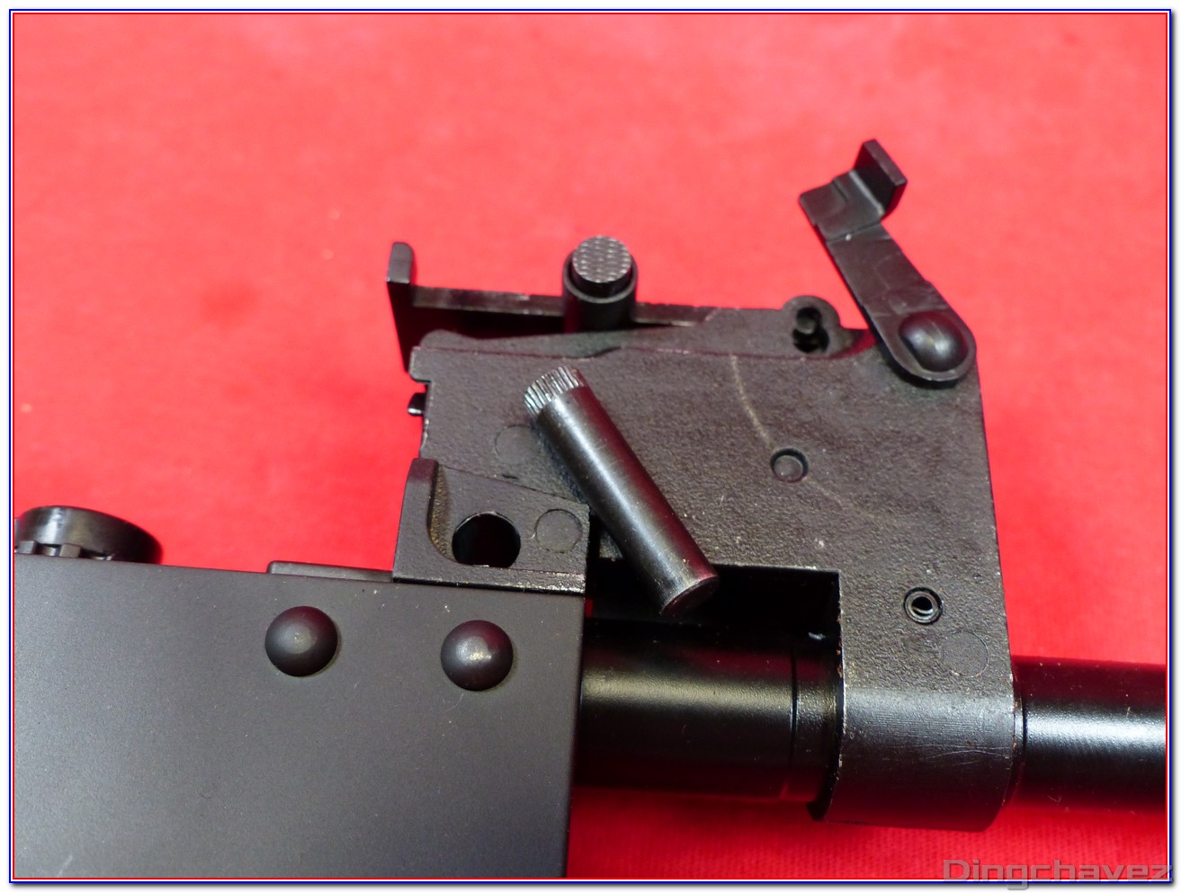 Une vue sur la queue de détente et son renvoi du démon. J’ai bon espoir qu’un jour une vraie solution alternative adoptée par tous les fabricants remplace ce système archaïque…
