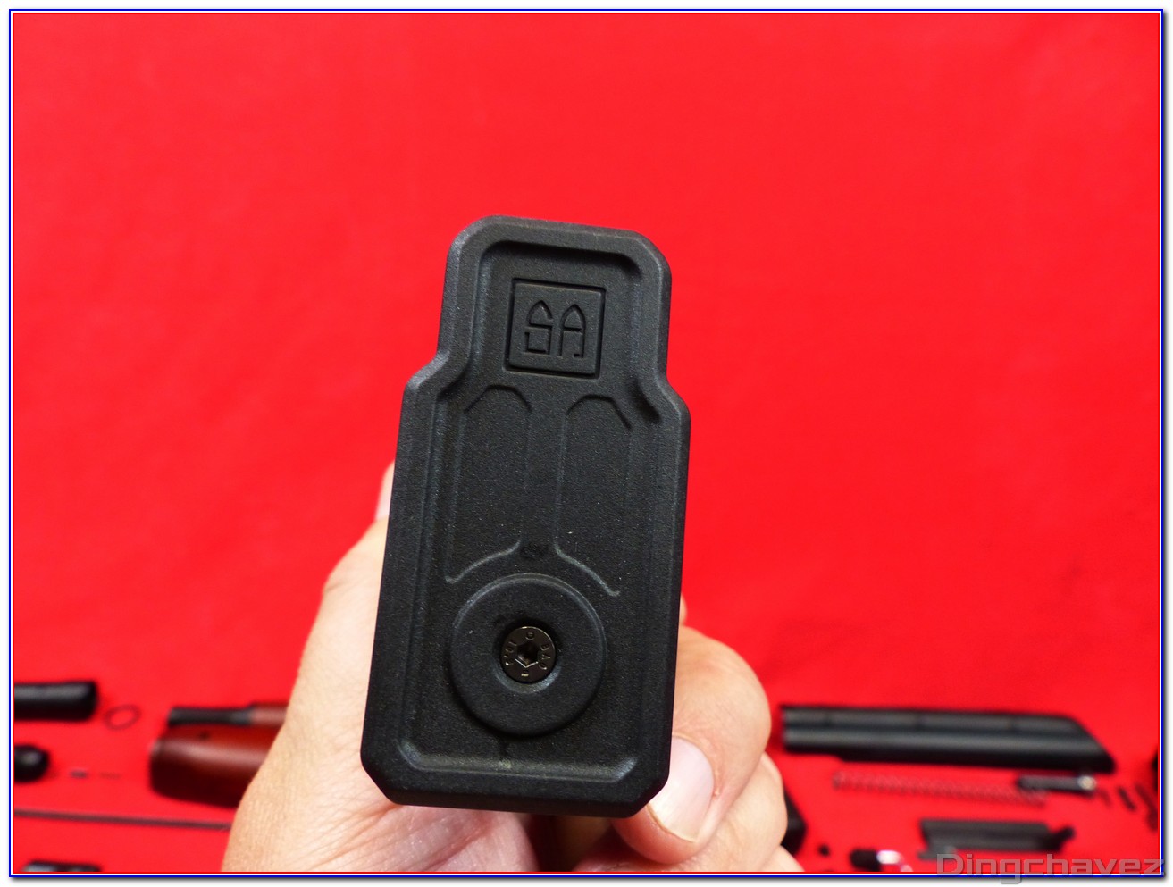 Le loquet de verrouillage du chargeur est en acier, il est situé devant le pontet et peut être actionné indifféremment par un joueur droitier ou gaucher.