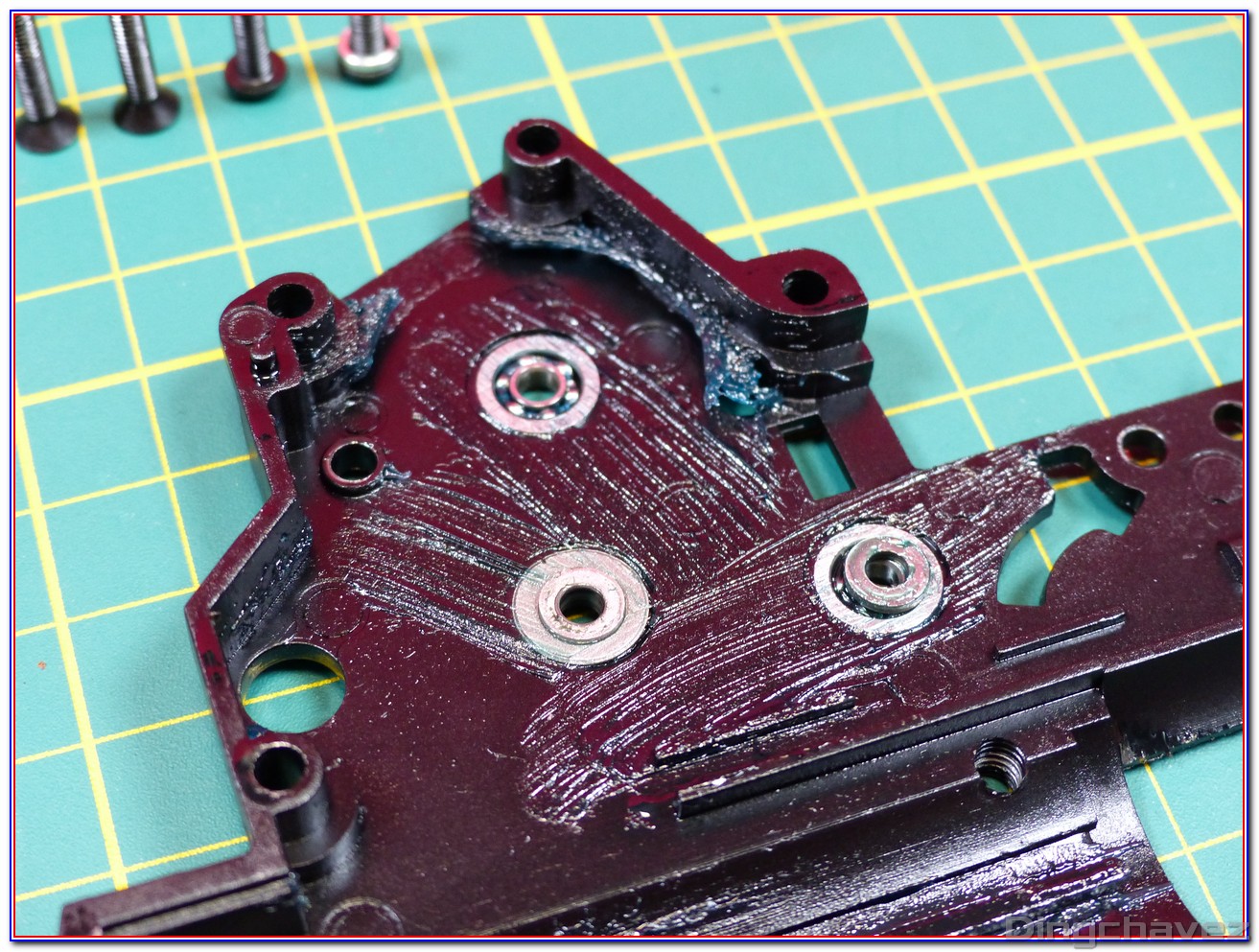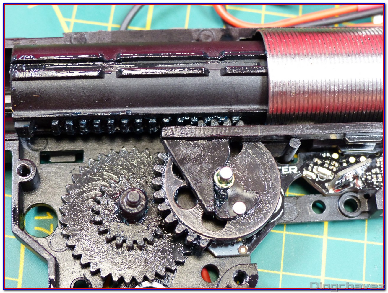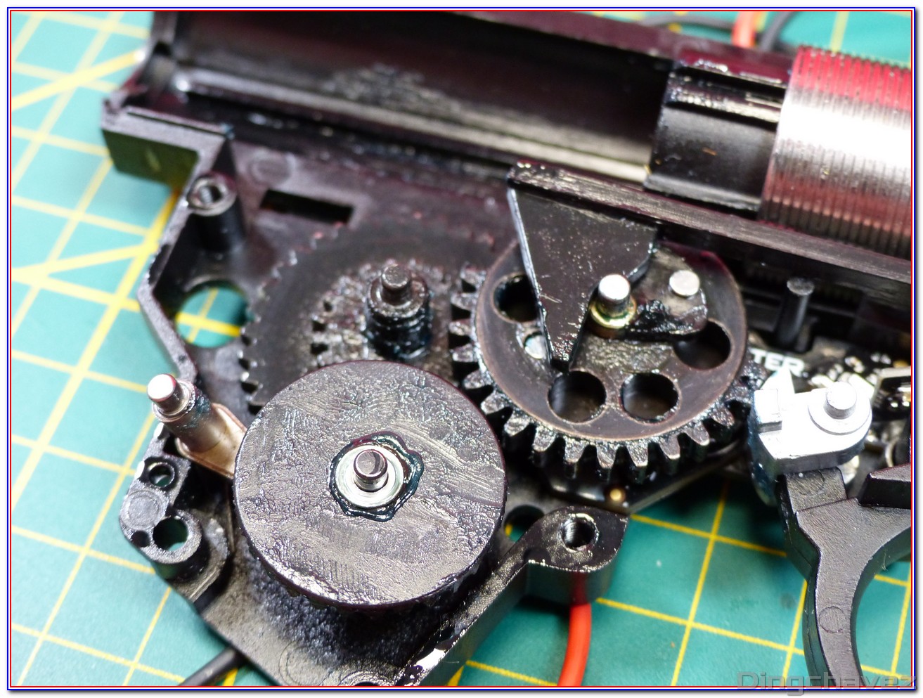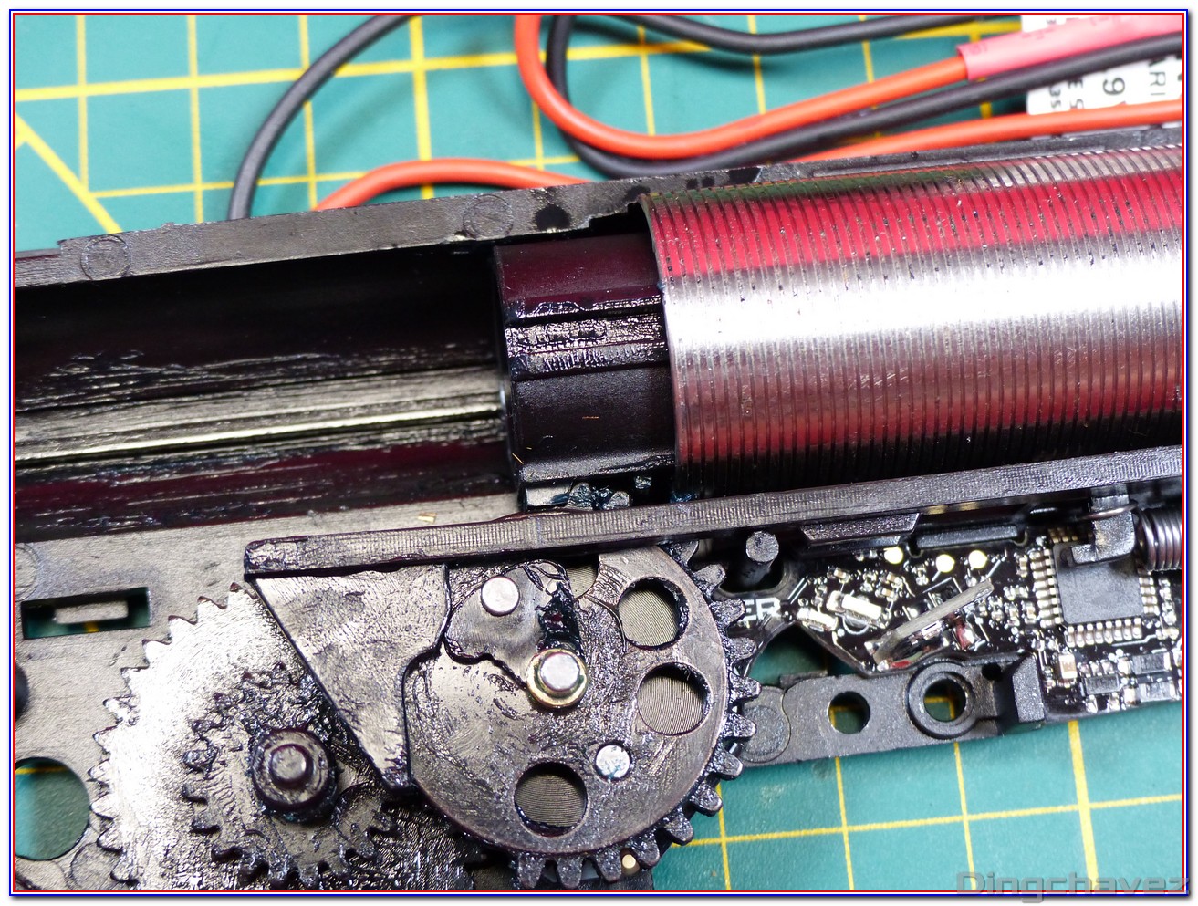 Et voilà ! Même de loin, on constate que la lubrification est faite trèèèèèèès rapidement au pinceau. Tchic, tchac, à l’arrache mais au moins il y a de la graisse là où il en faut (et « un peu » autour ^^).