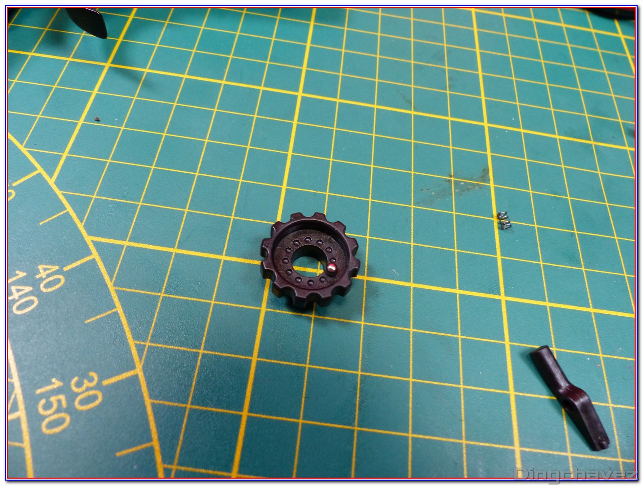 On peut voir que le bevel gear et le sector gear prennent place sur des roulements (bearings) de 8mm tandis que le spur gear est monté sur des paliers (bushing) de 8mm en acier.