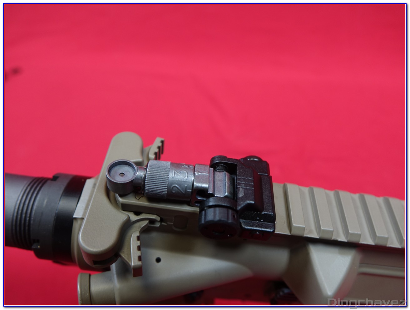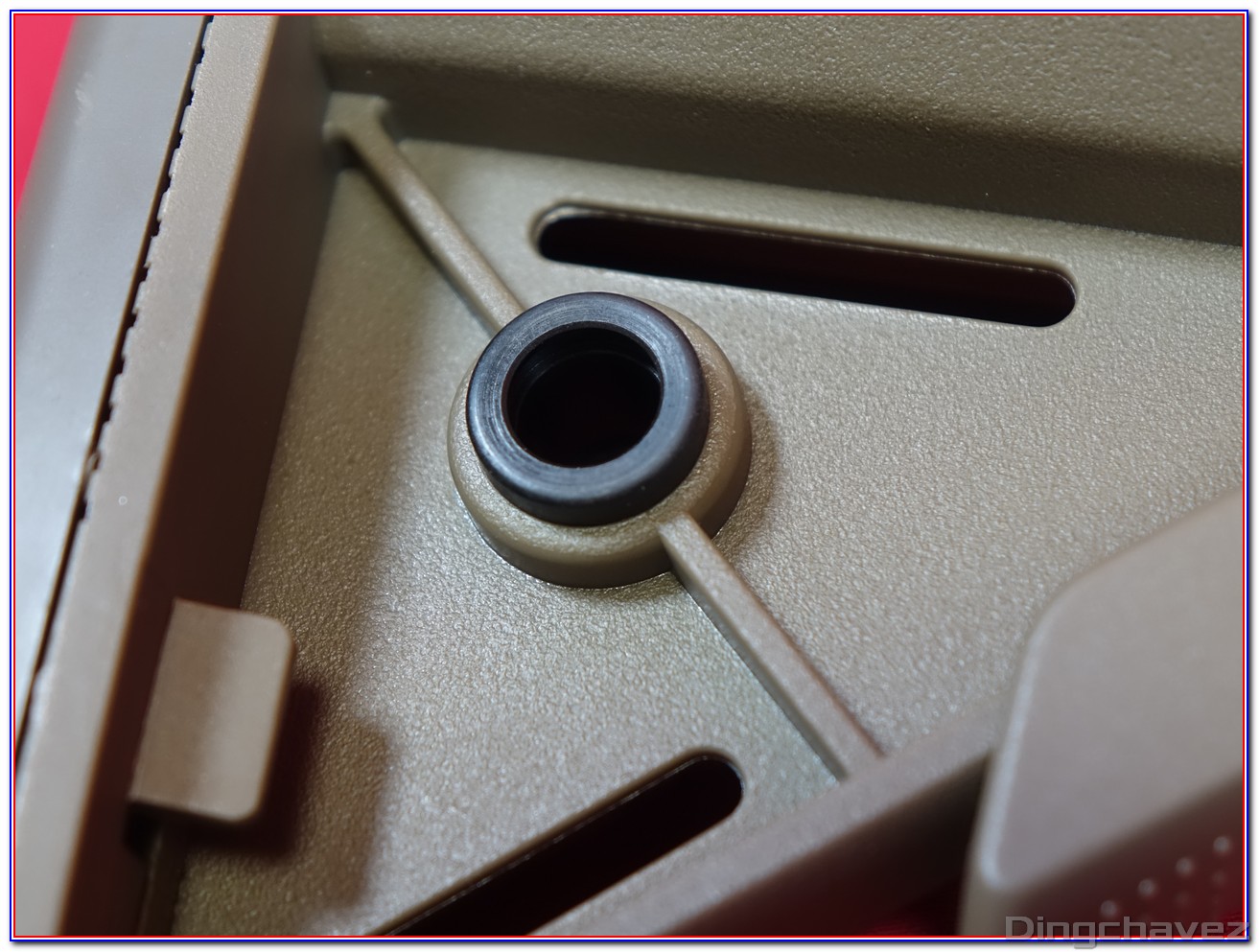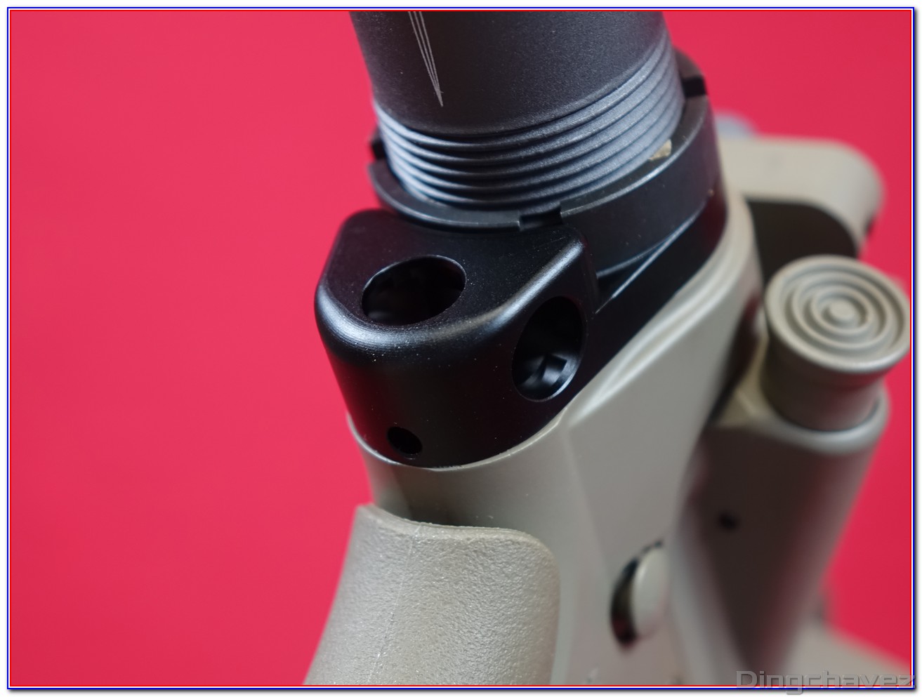 Deux évents ont été percé sur le côté, soi-disant pour augmenter l’efficacité de la réplique. Je ne saurais pas vous dire si cela change quelque chose étant donné que je ne possède pas d’autre AR-15 GBBR de la marque taïwanaise.