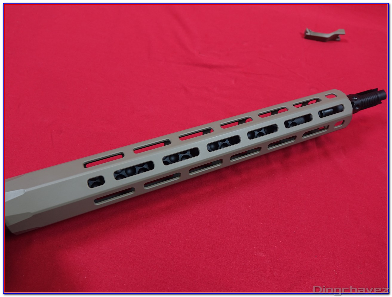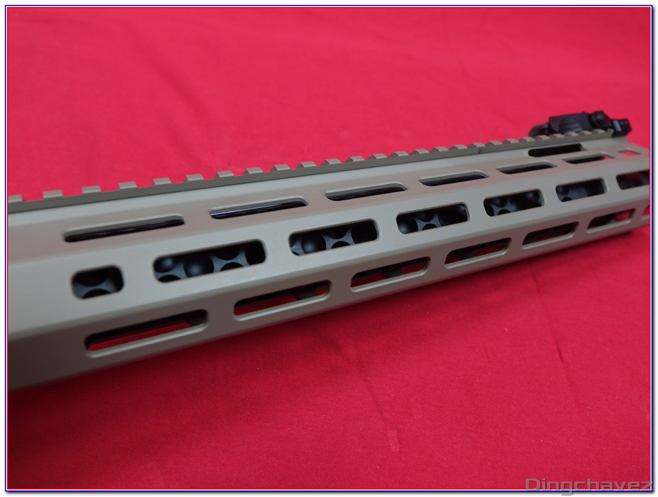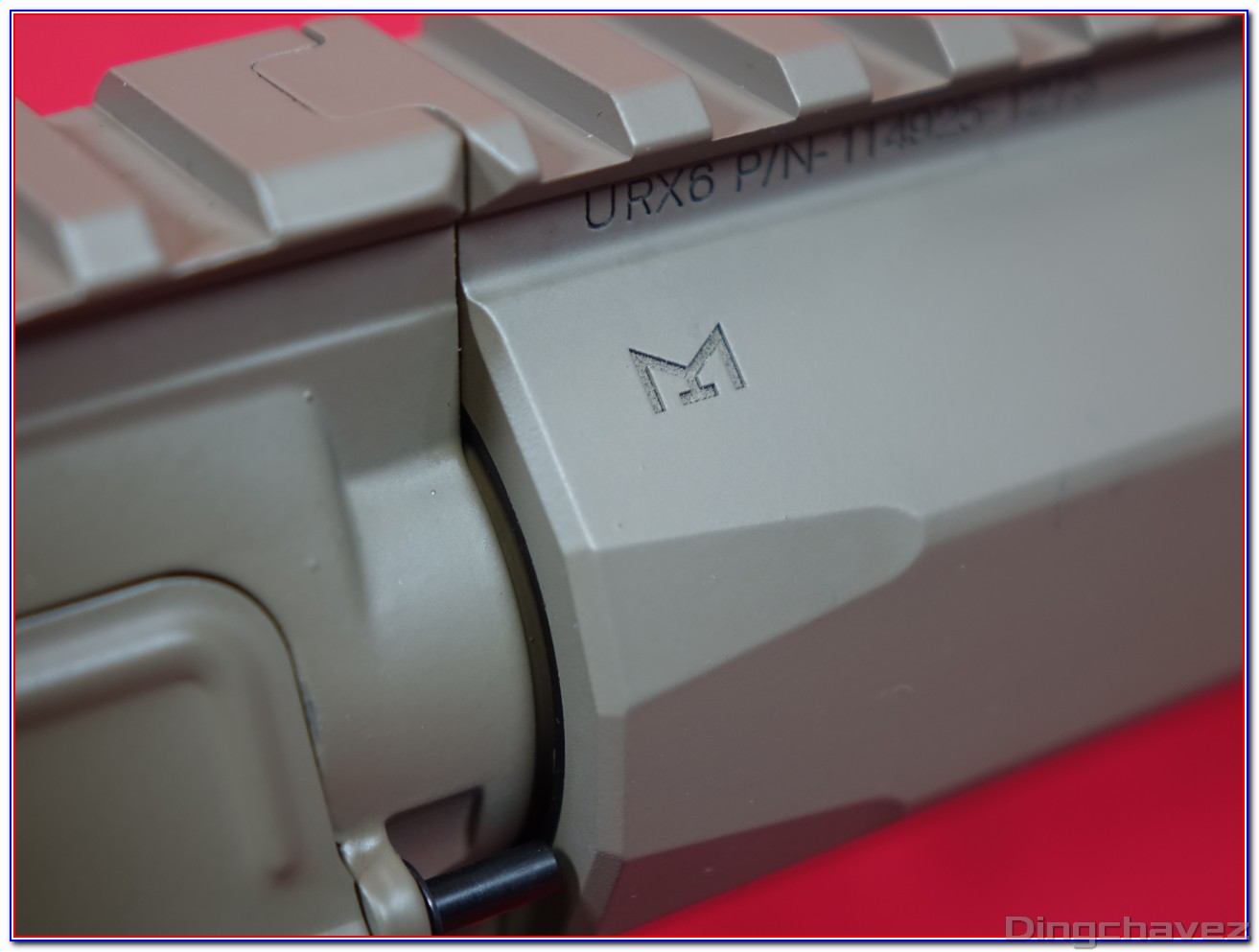 Des ports MLOK y sont usinés sur toutes les faces sauf la face supérieure, équipée d’un rail Picatinny.