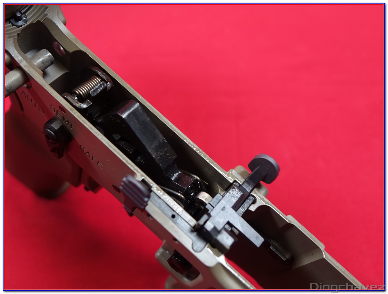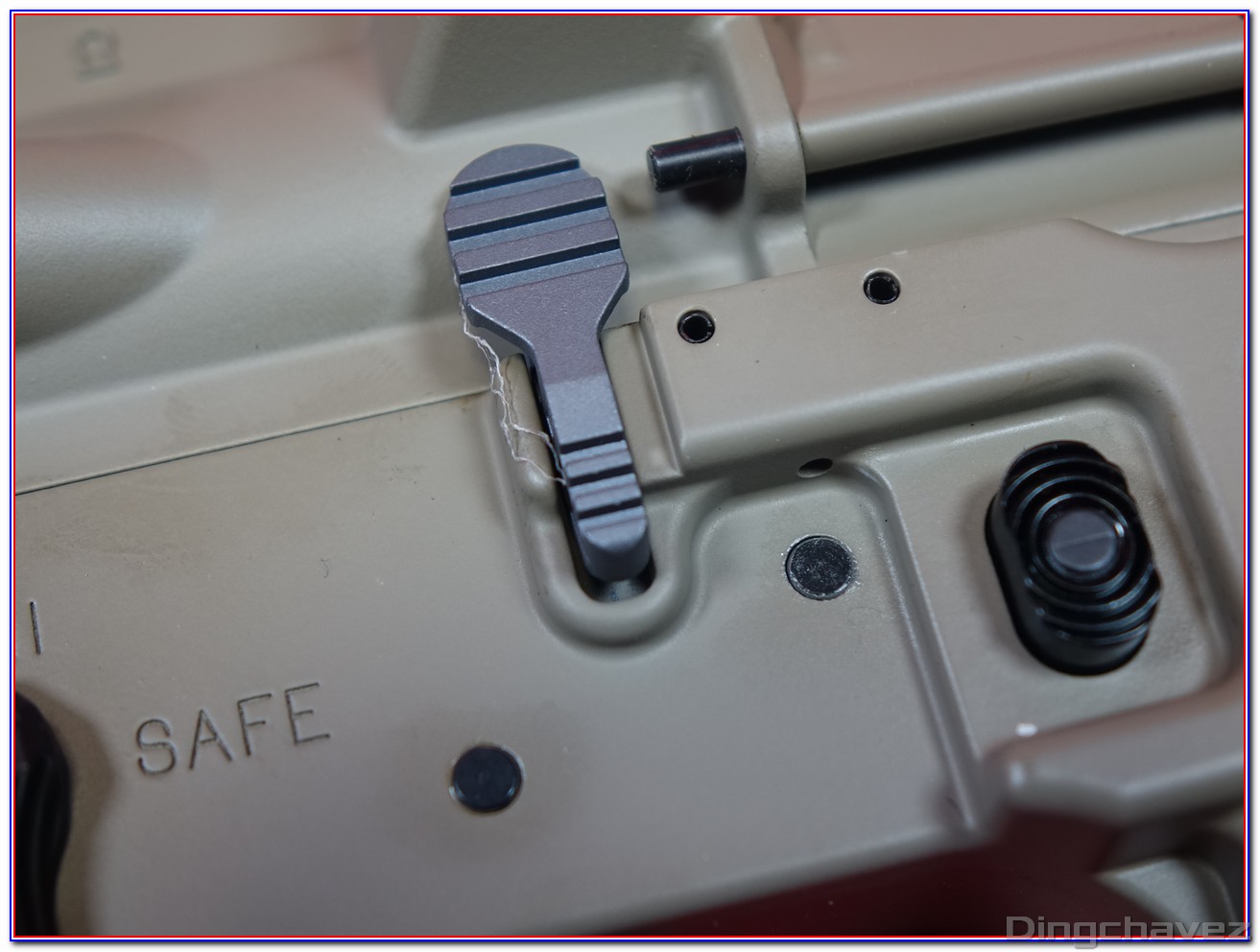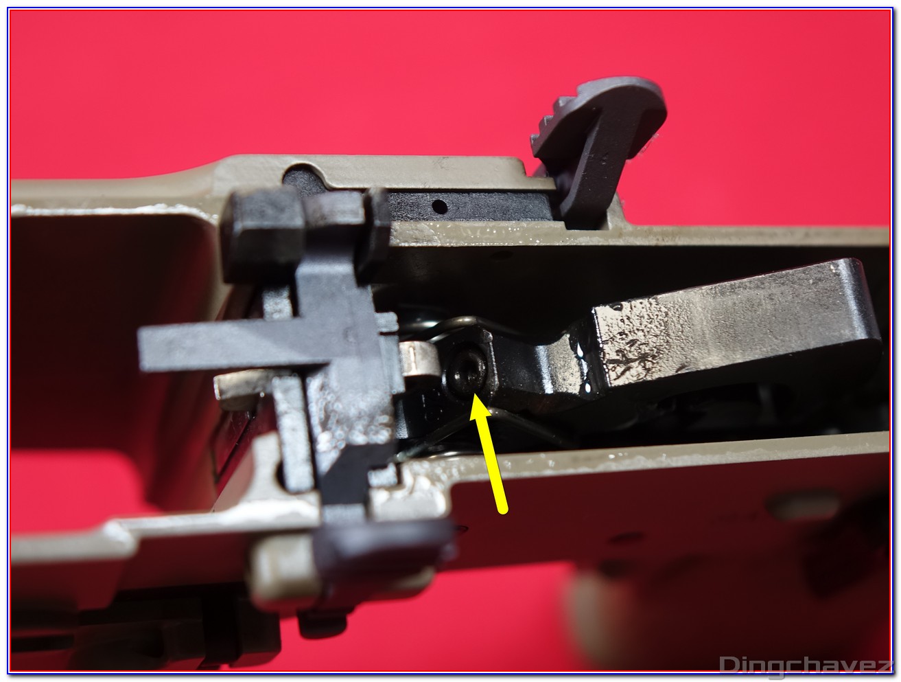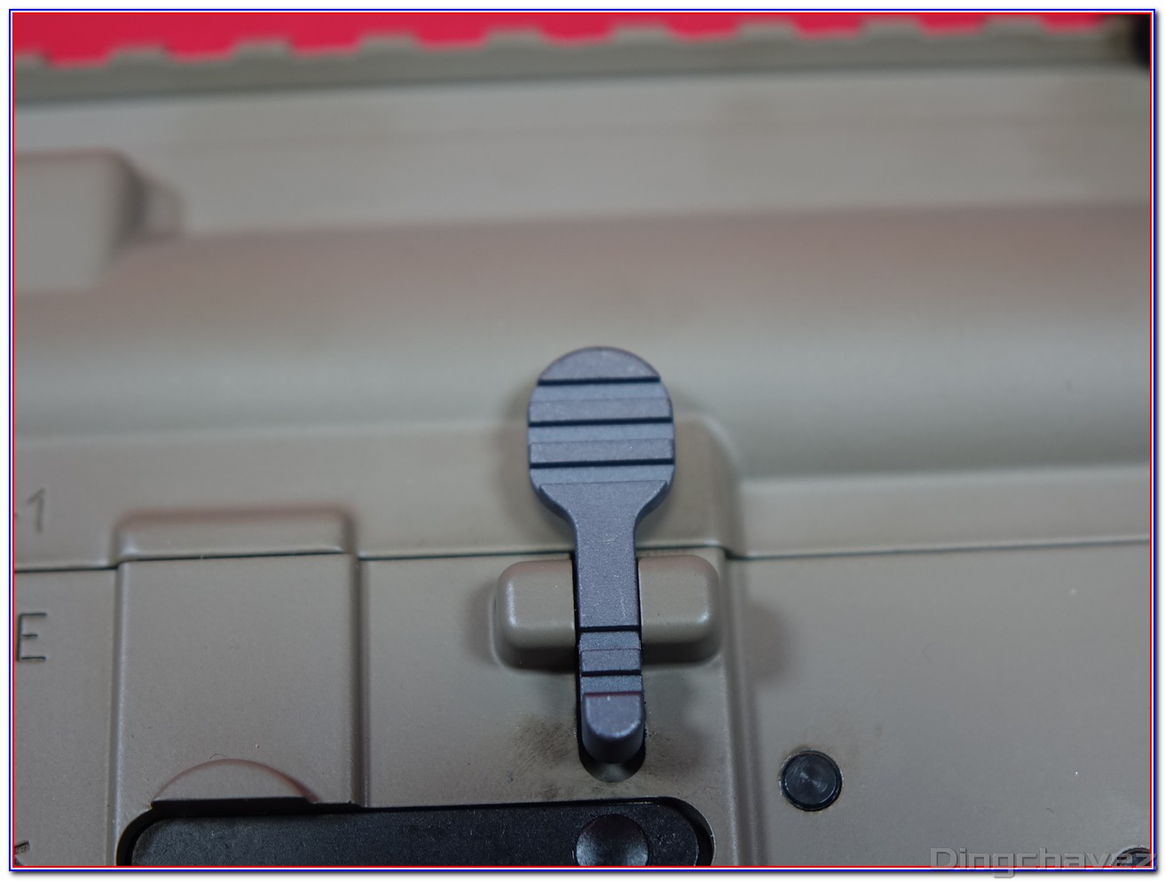 En rouge, le système d’arrêt de tir en fin de chargeur. Il peut être désactivé en poussant la petite languette située à gauche vers l’arrière comme sur cette photo.