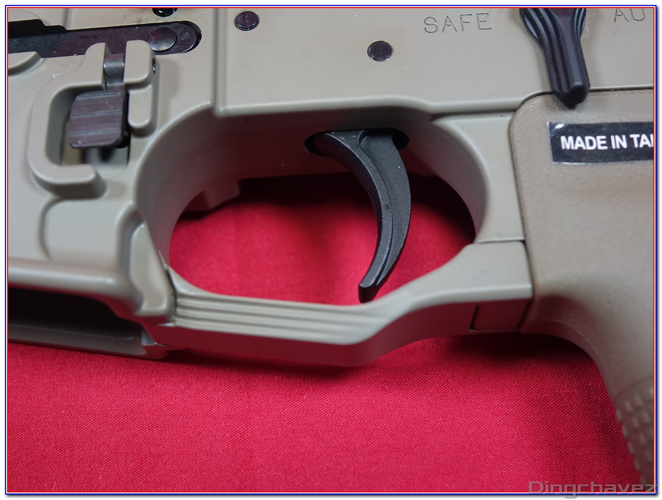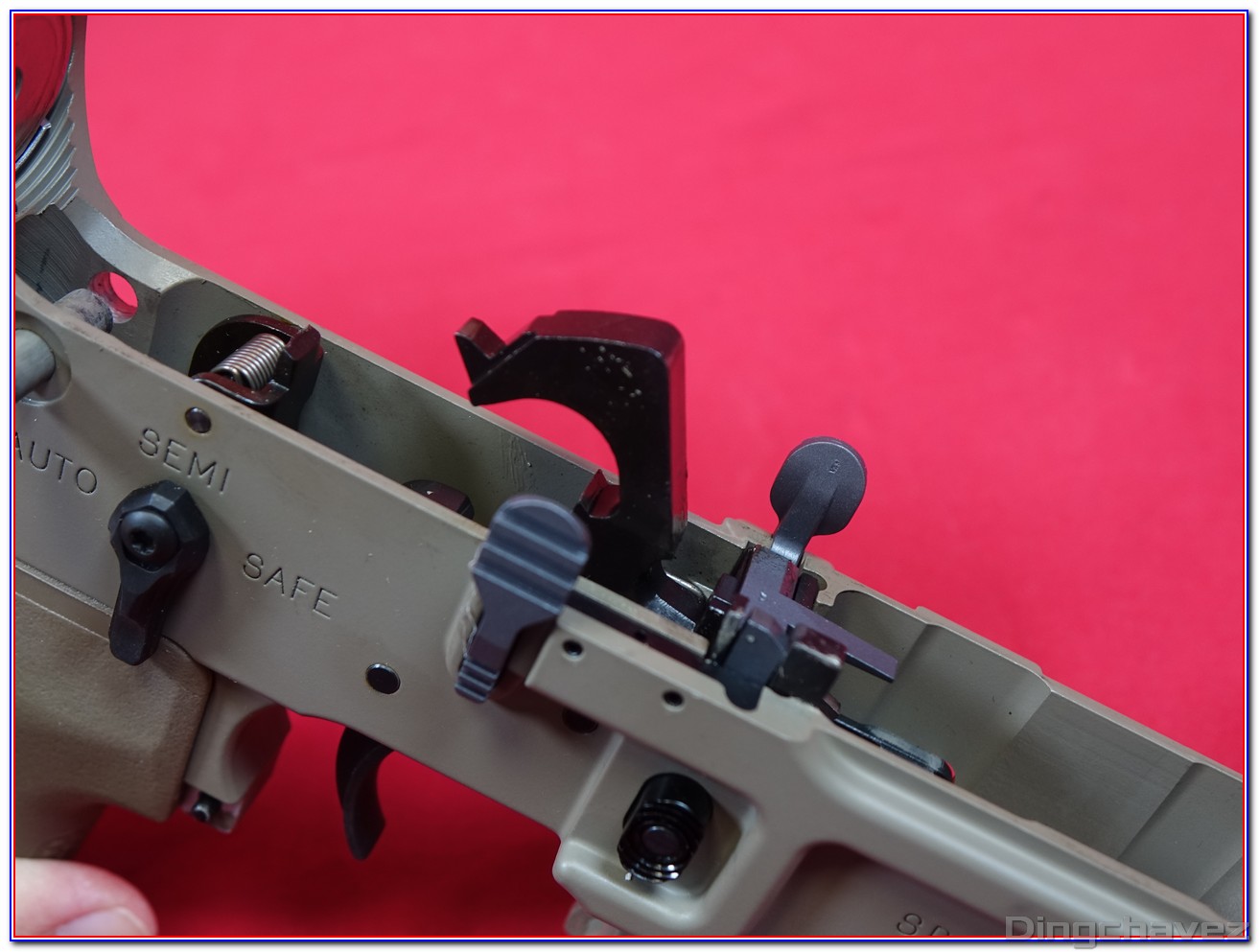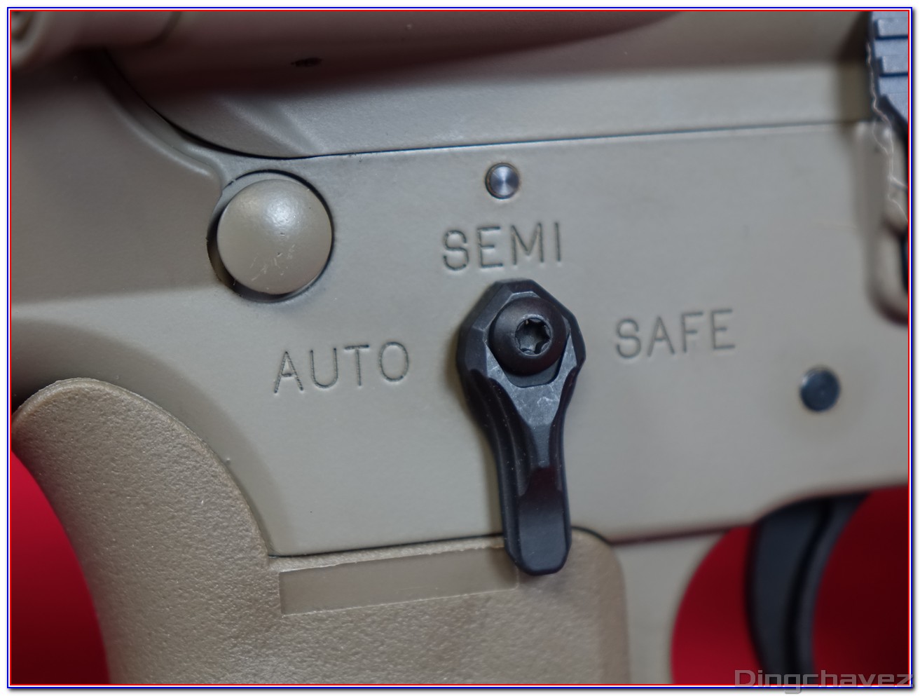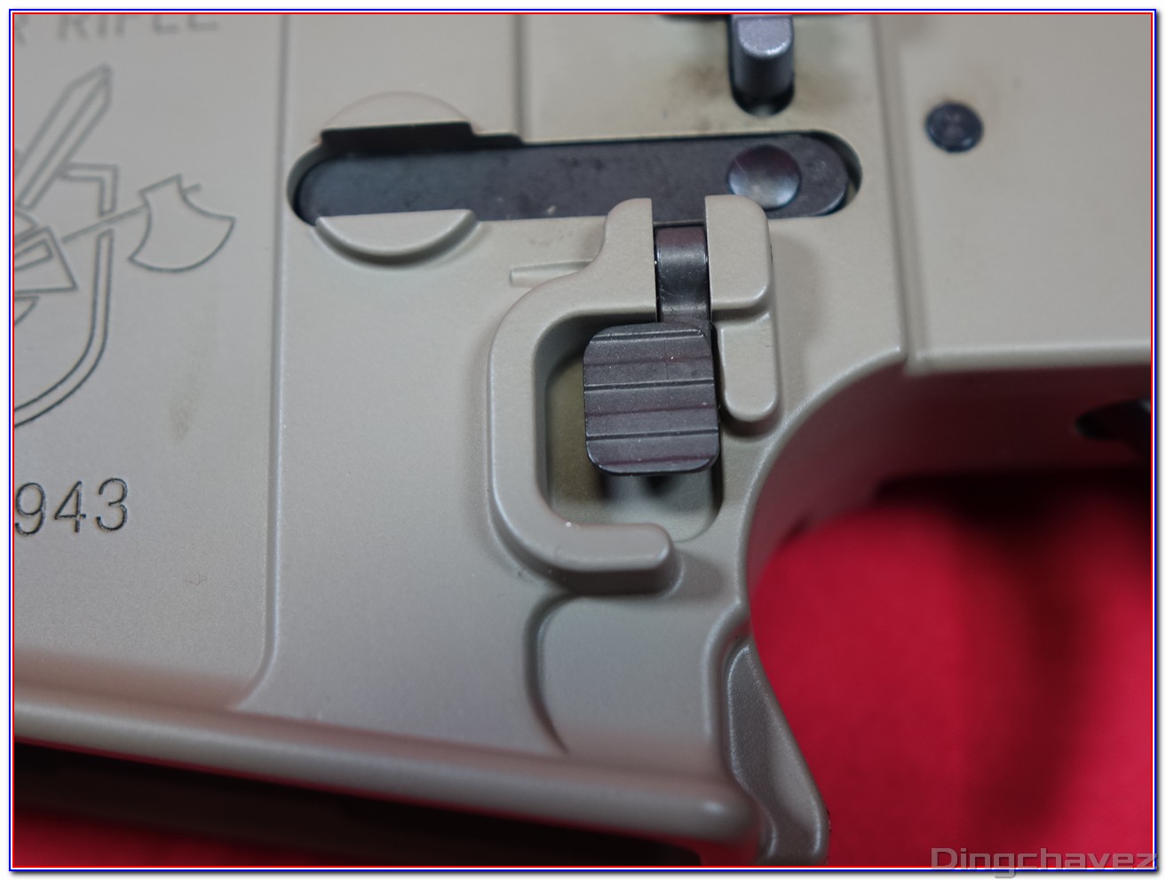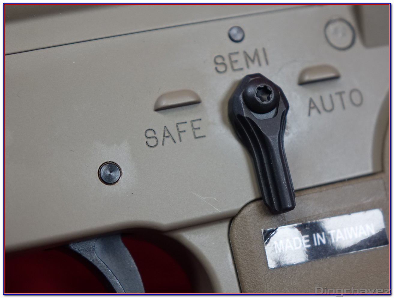 En rouge, le système d’arrêt de tir en fin de chargeur. Il peut être désactivé en poussant la petite languette située à gauche vers l’arrière comme sur cette photo.