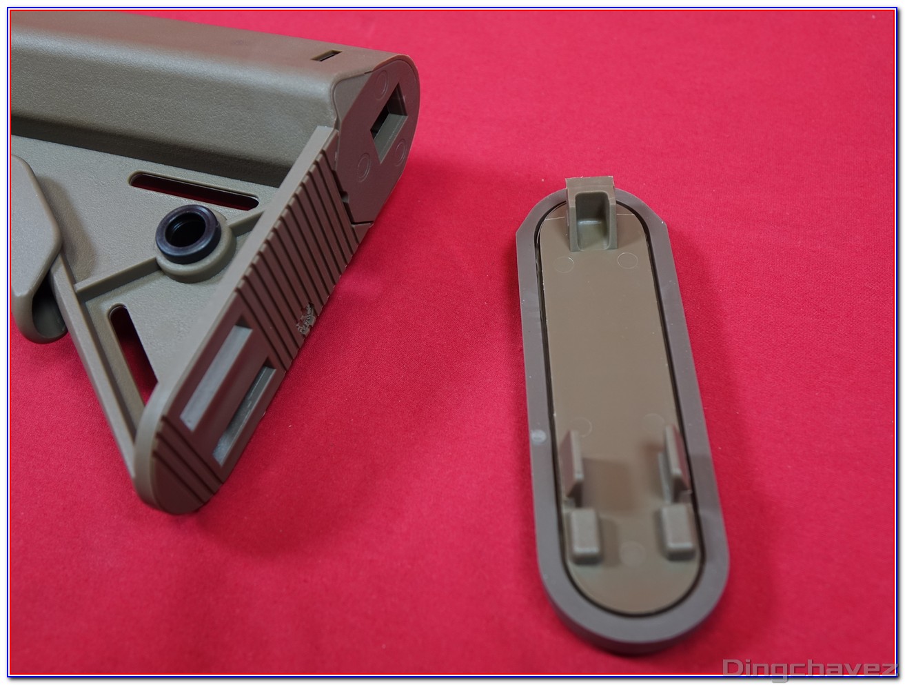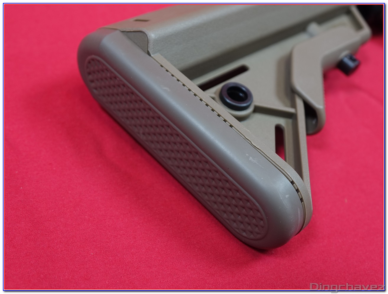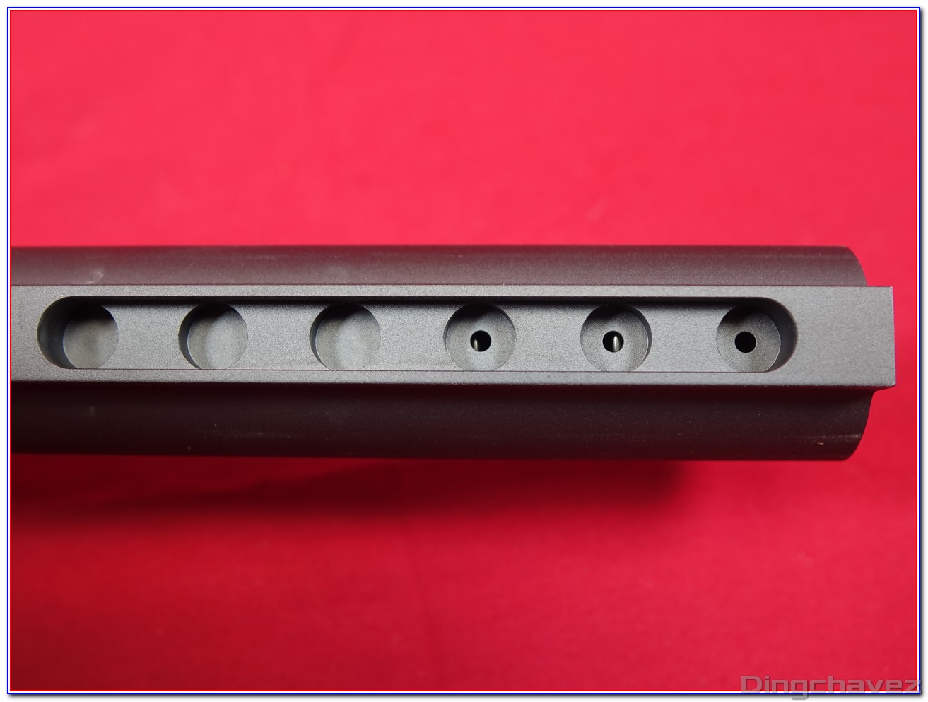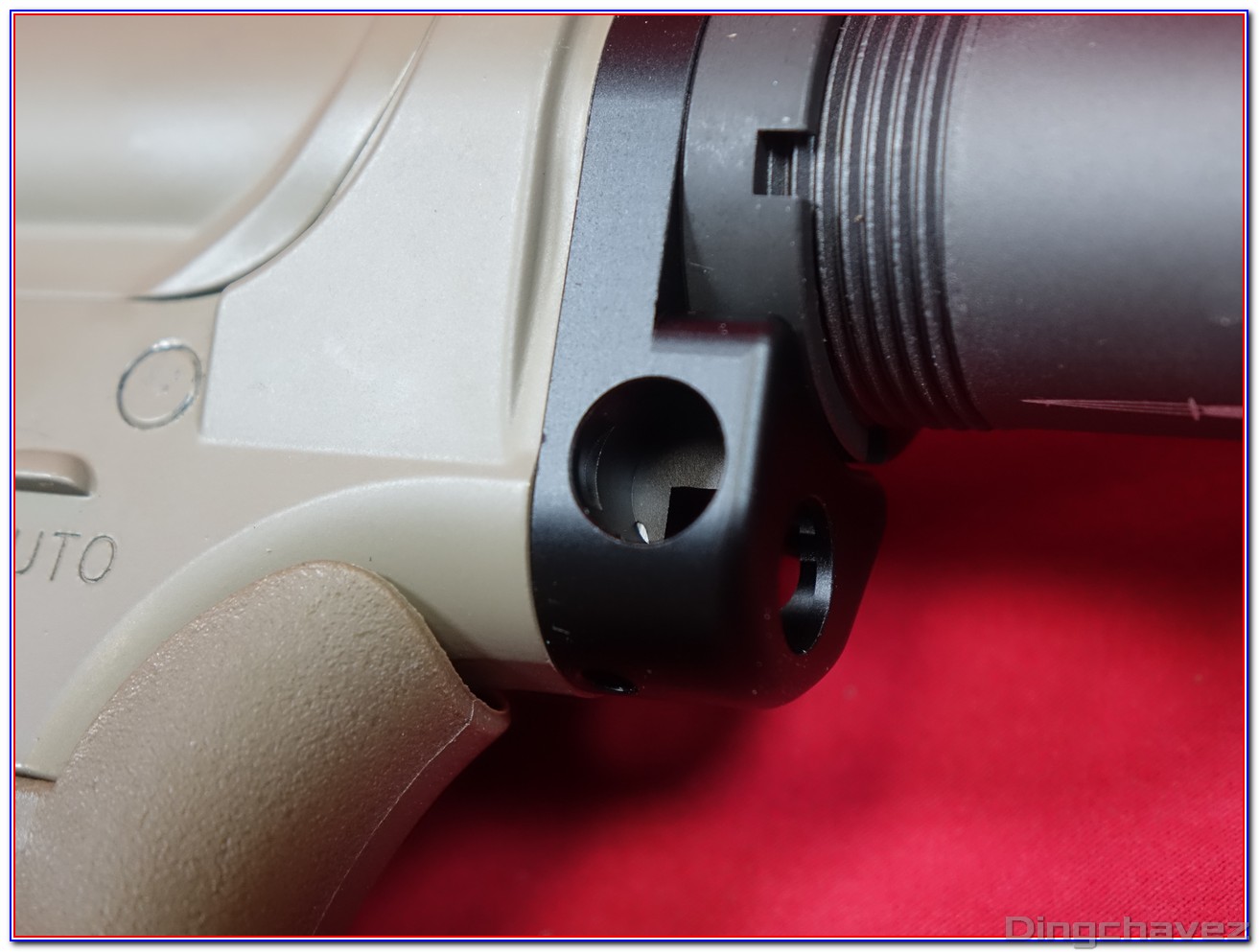 Le tube de crosse (buffer tube) comporte 6 emplacement permettant d’ajuster la longueur de crosse. Remarquez les 3 petit trous présents sur les 3 derniers emplacements.