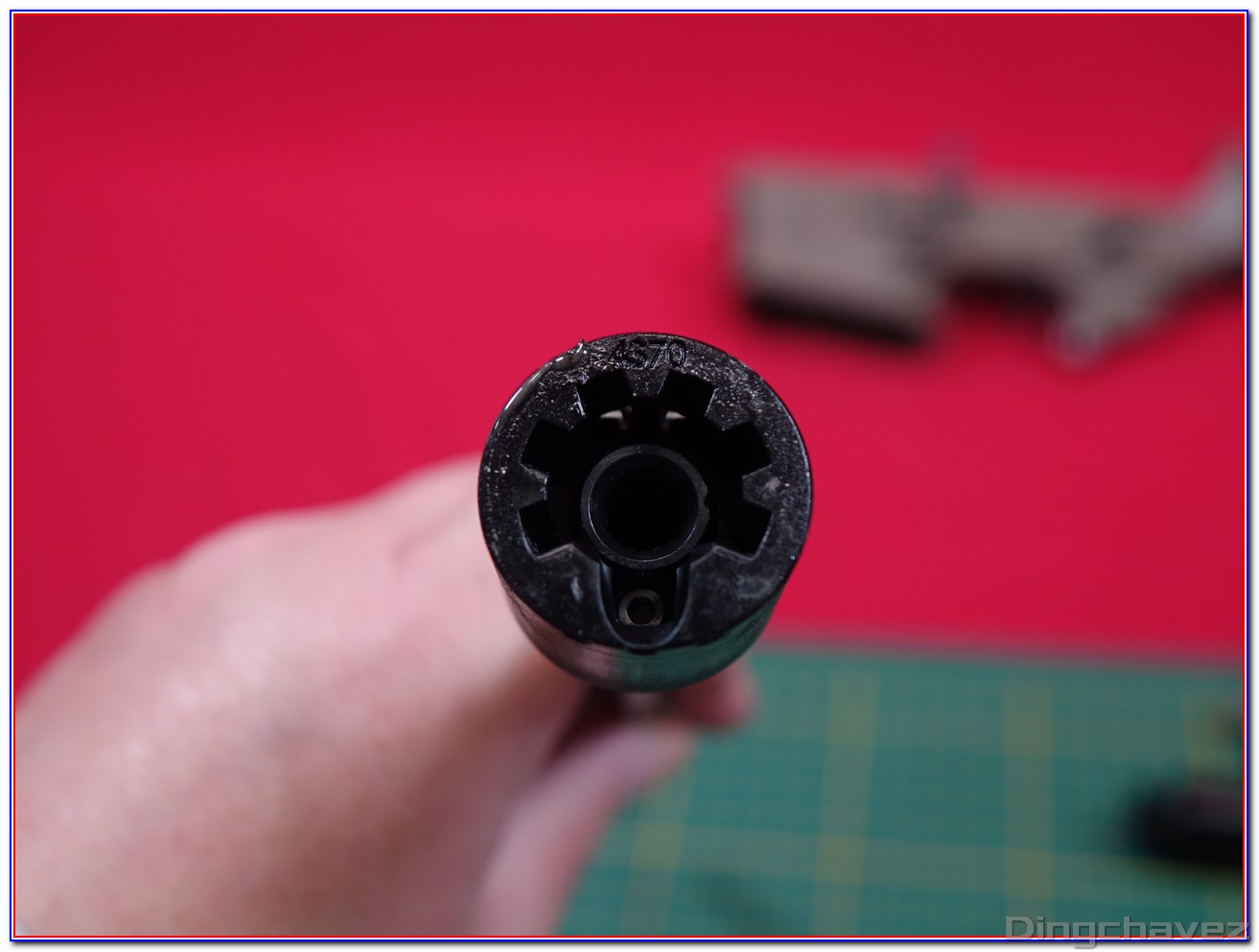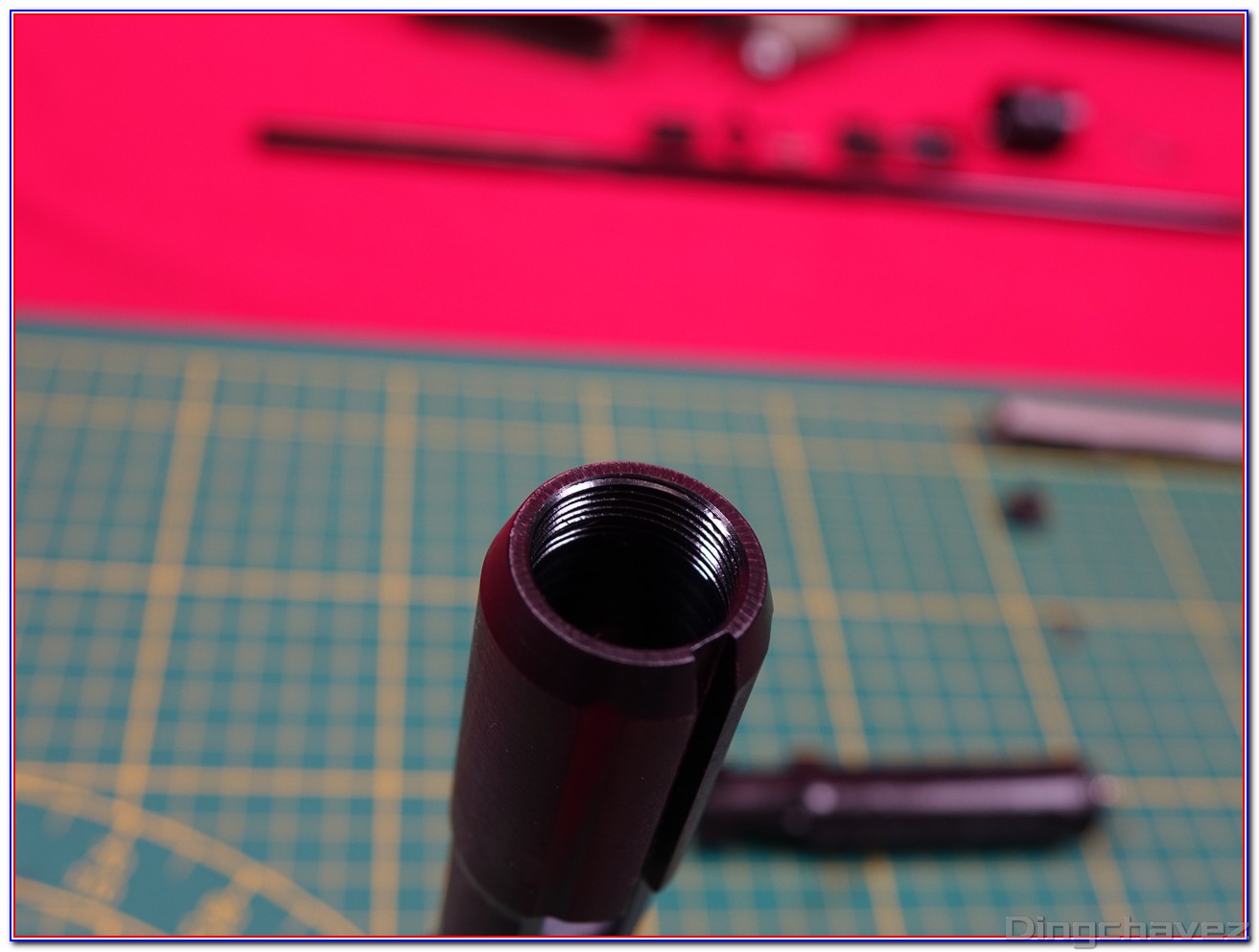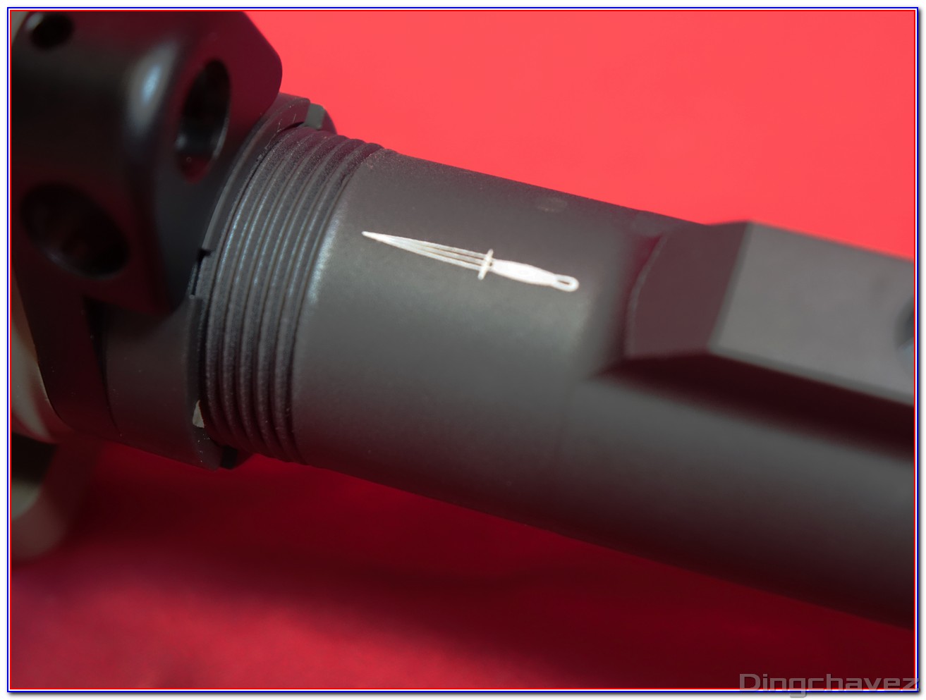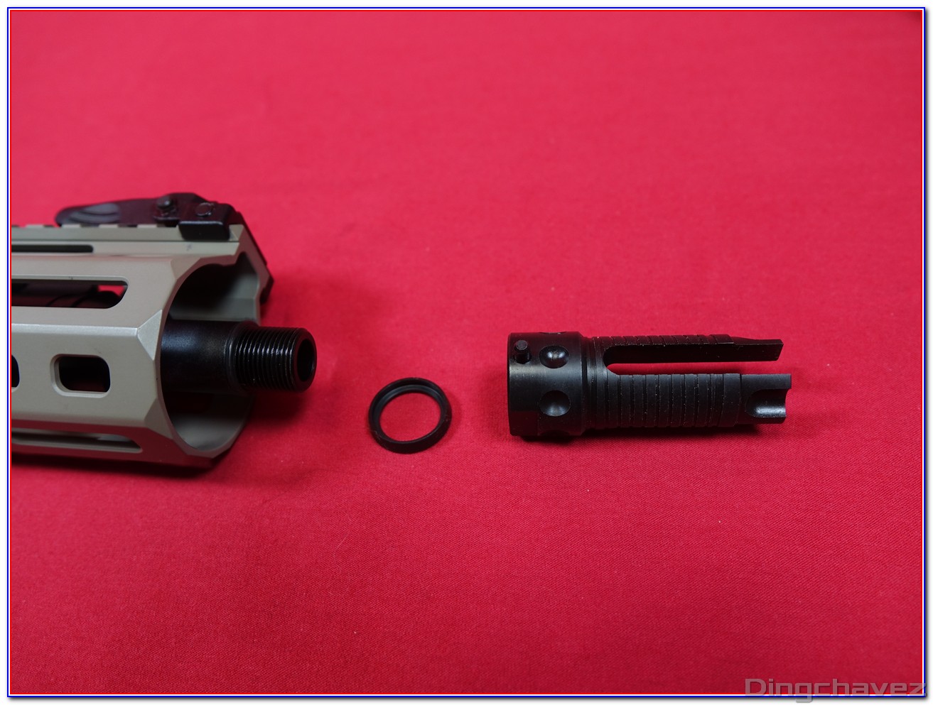 Le compensateur en acier est vissé sur le canon externe via un filetage au pas de 14mm antihoraire (CCW).