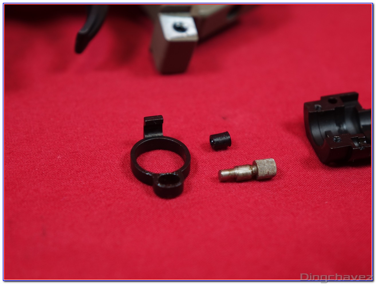 Retirons le levier de chargement et l’ensemble mobile. Ce dernier est en acier, c’est le cas également de la clé d’emprunt des gaz.