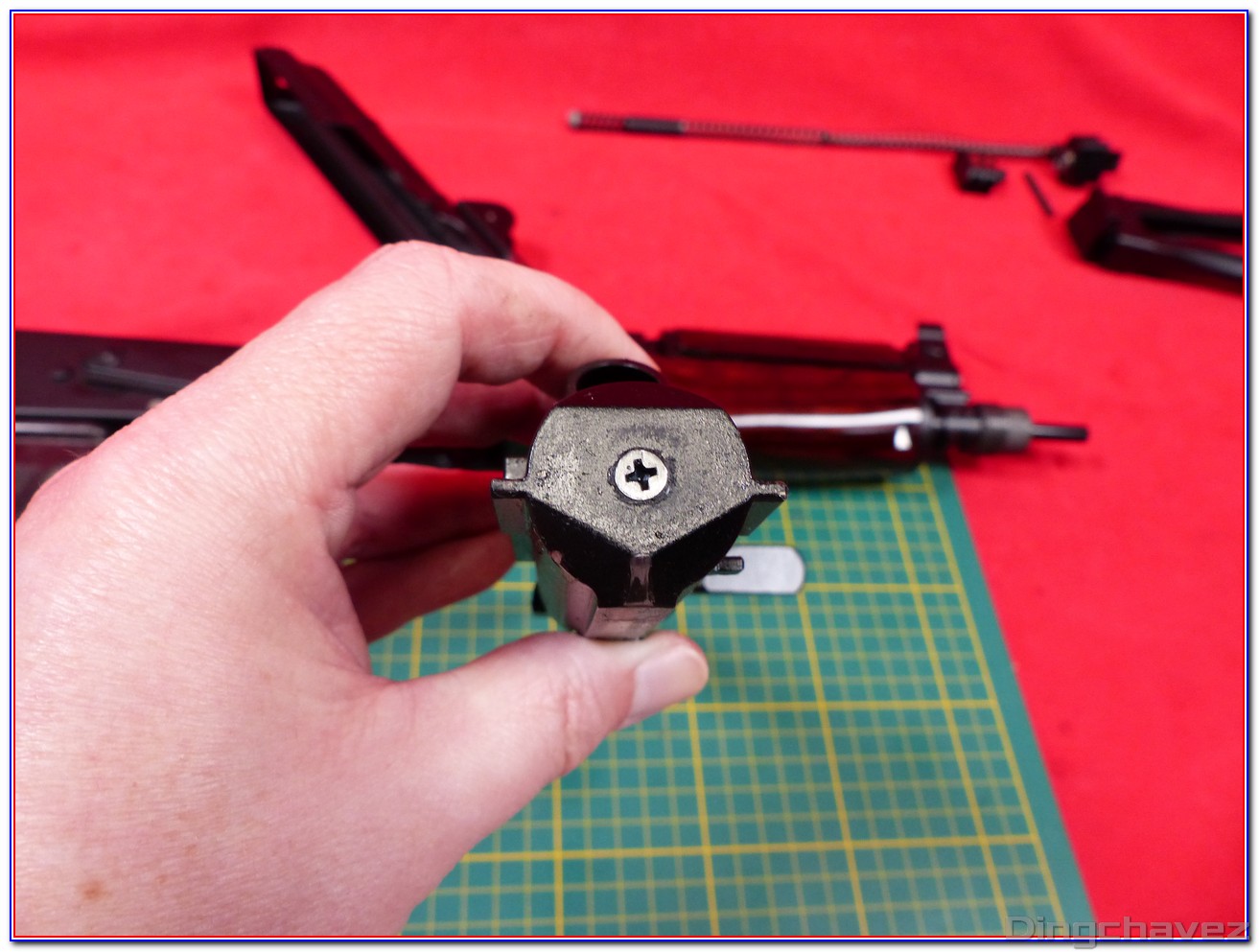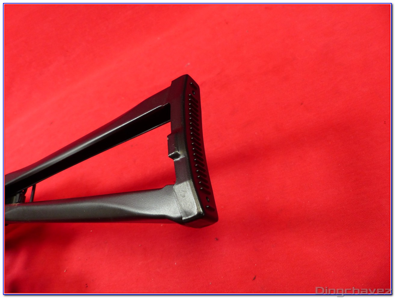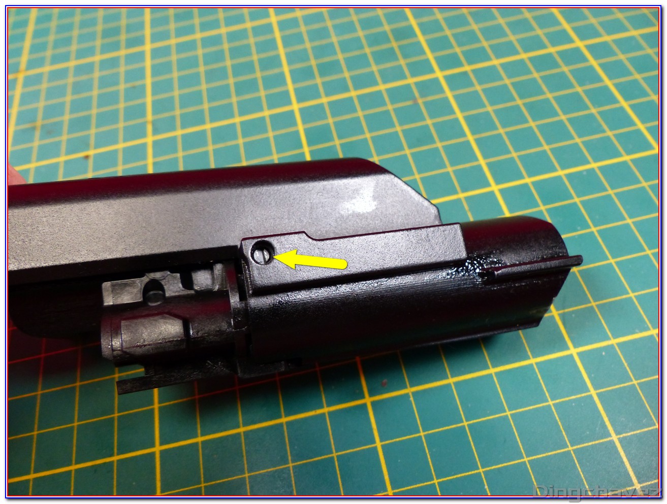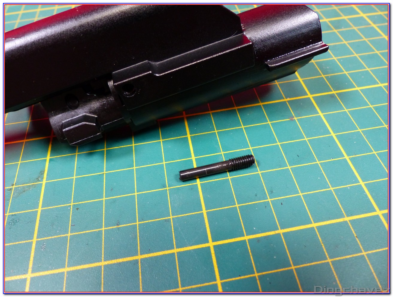 Comme vous avez pu le remarquer, j’ai rapidement changé la poignée pistolet, celle-ci est vissée sur un support situé dans le corps de la réplique. ATTENTION : le support tombe lorsqu’on dévisse.