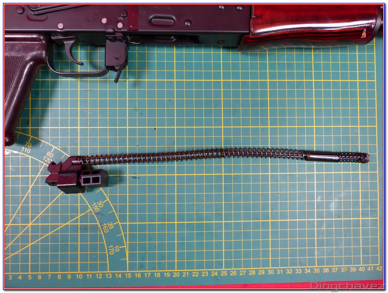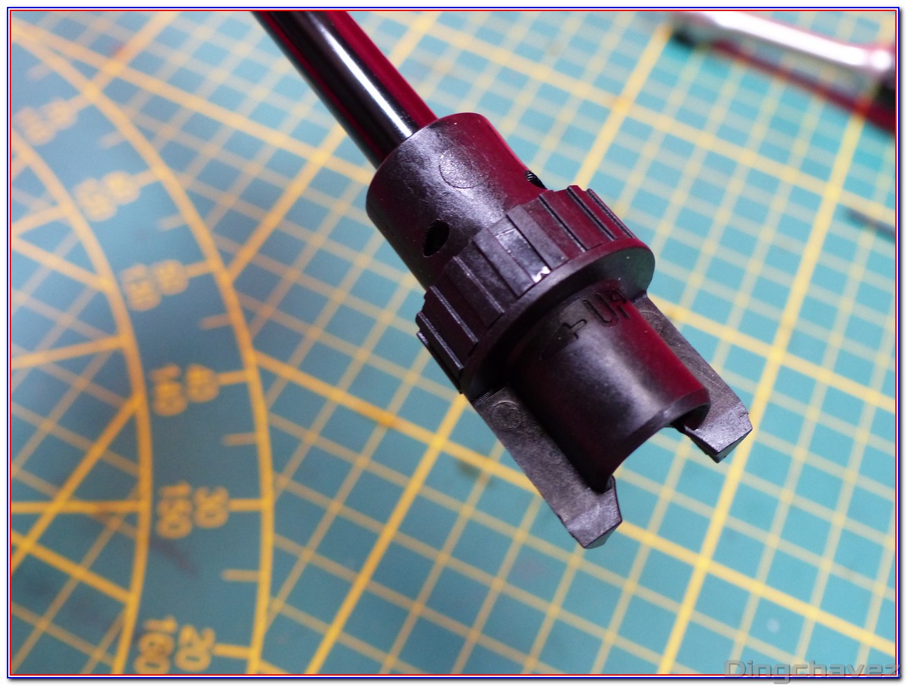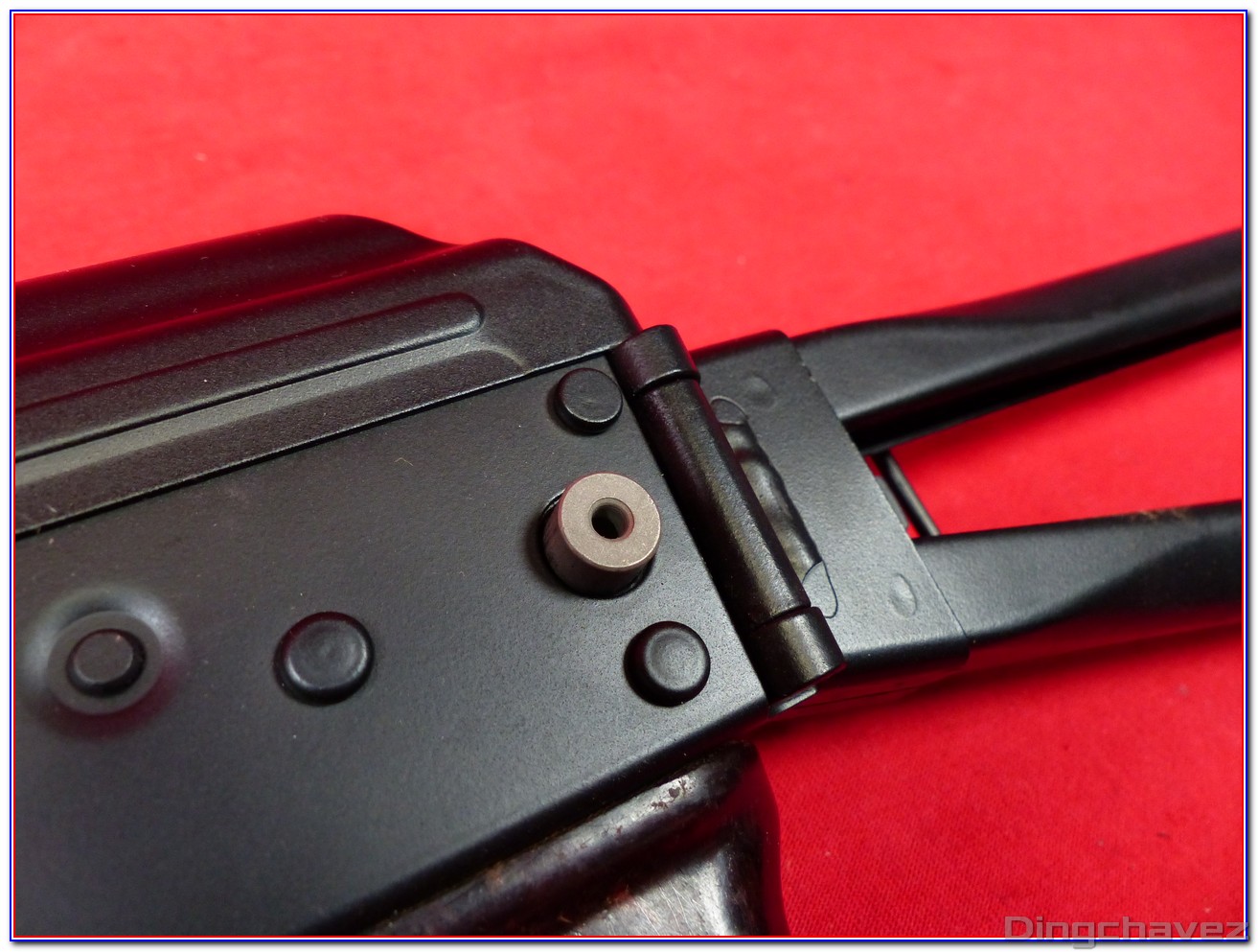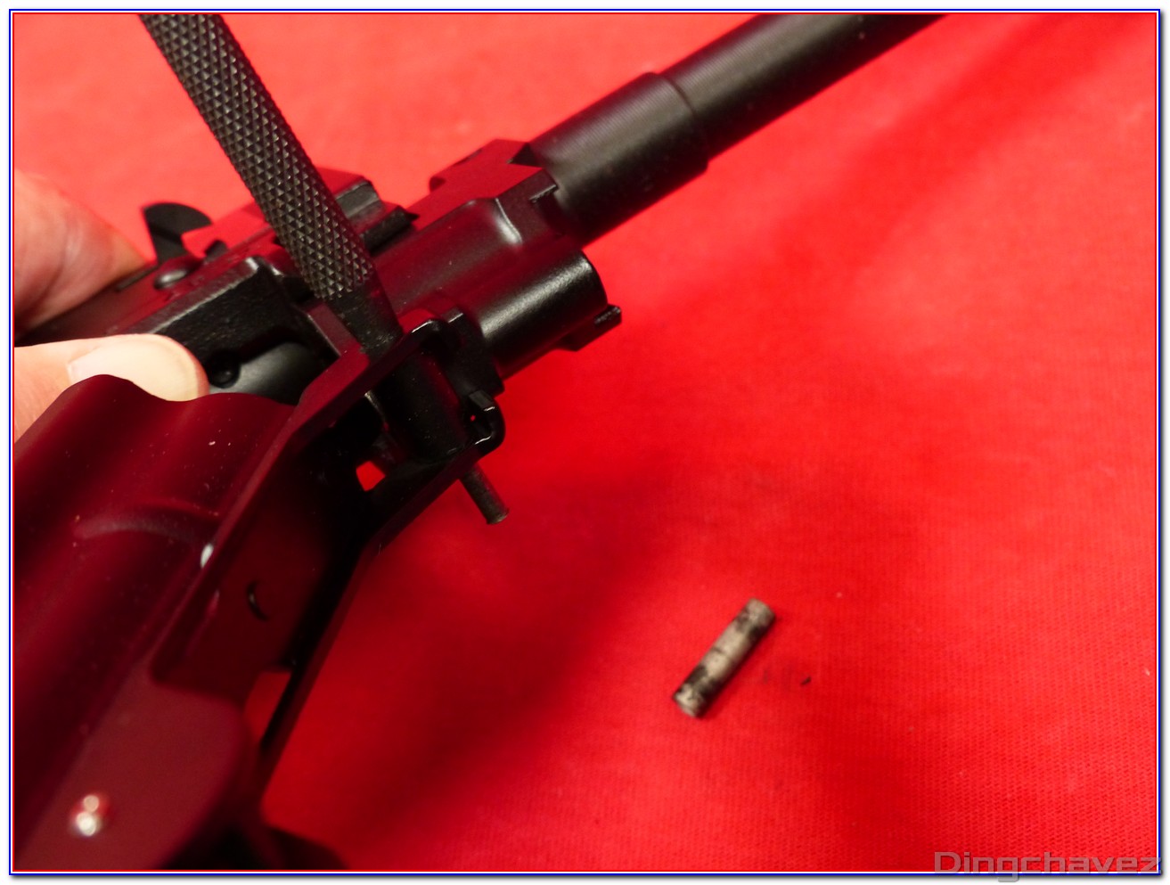 Comme vous avez pu le remarquer, j’ai rapidement changé la poignée pistolet, celle-ci est vissée sur un support situé dans le corps de la réplique. ATTENTION : le support tombe lorsqu’on dévisse.