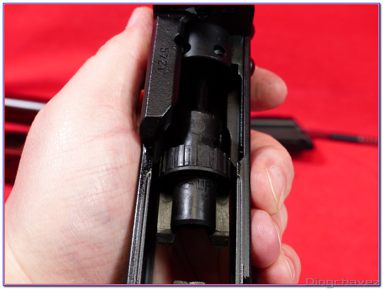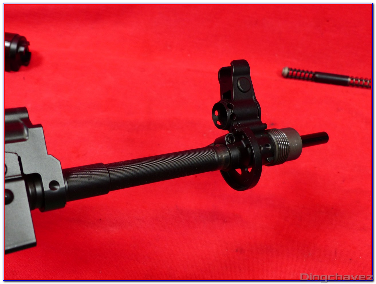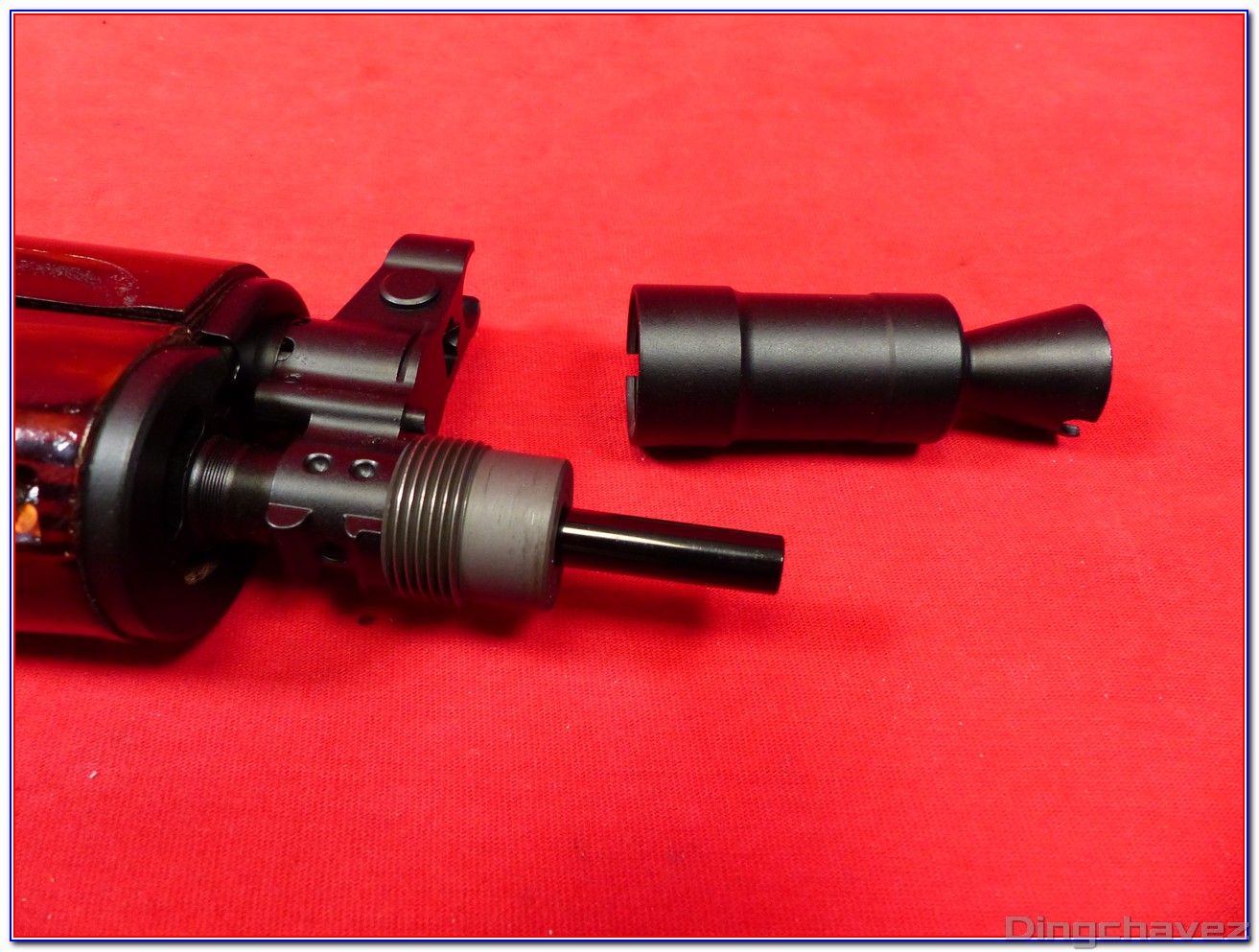 Ci-dessous on remarque l’amortisseur de course courte (short-stroke buffer). Il raccourci la course de l’ensemble mobile, procurant un cycle plus court et une cadence de tir légèrement plus élevée.