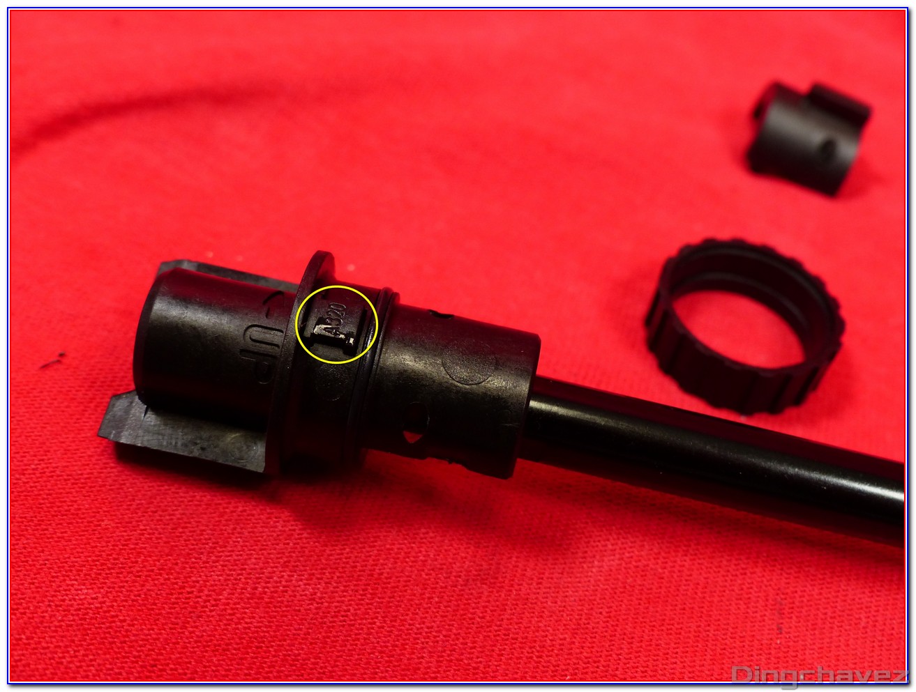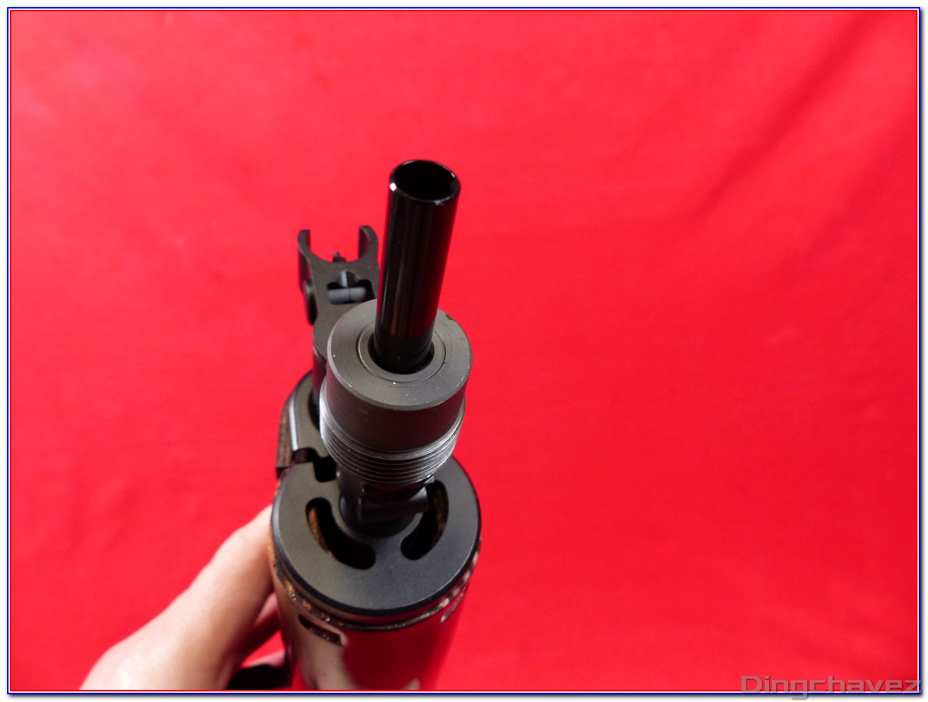 Cet AK est équipé d’un système d’arrêt de tir en fin de chargeur. Ici nous voyons qu’en l’absence de billes, l’extension n’est pas visible et ne peut donc pas être frappée par le percuteur (valve knocker).