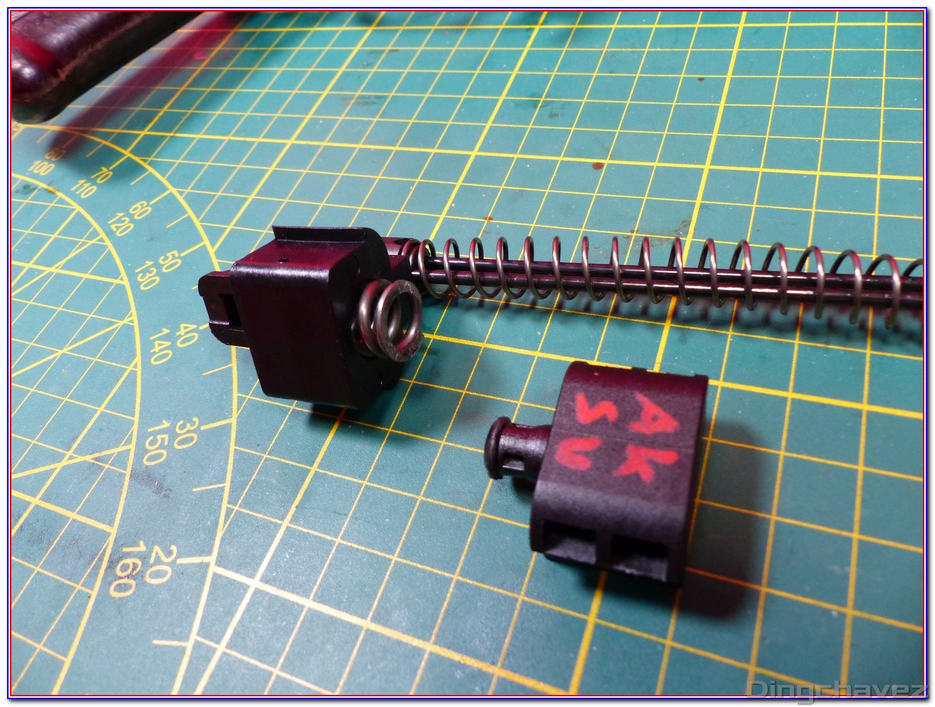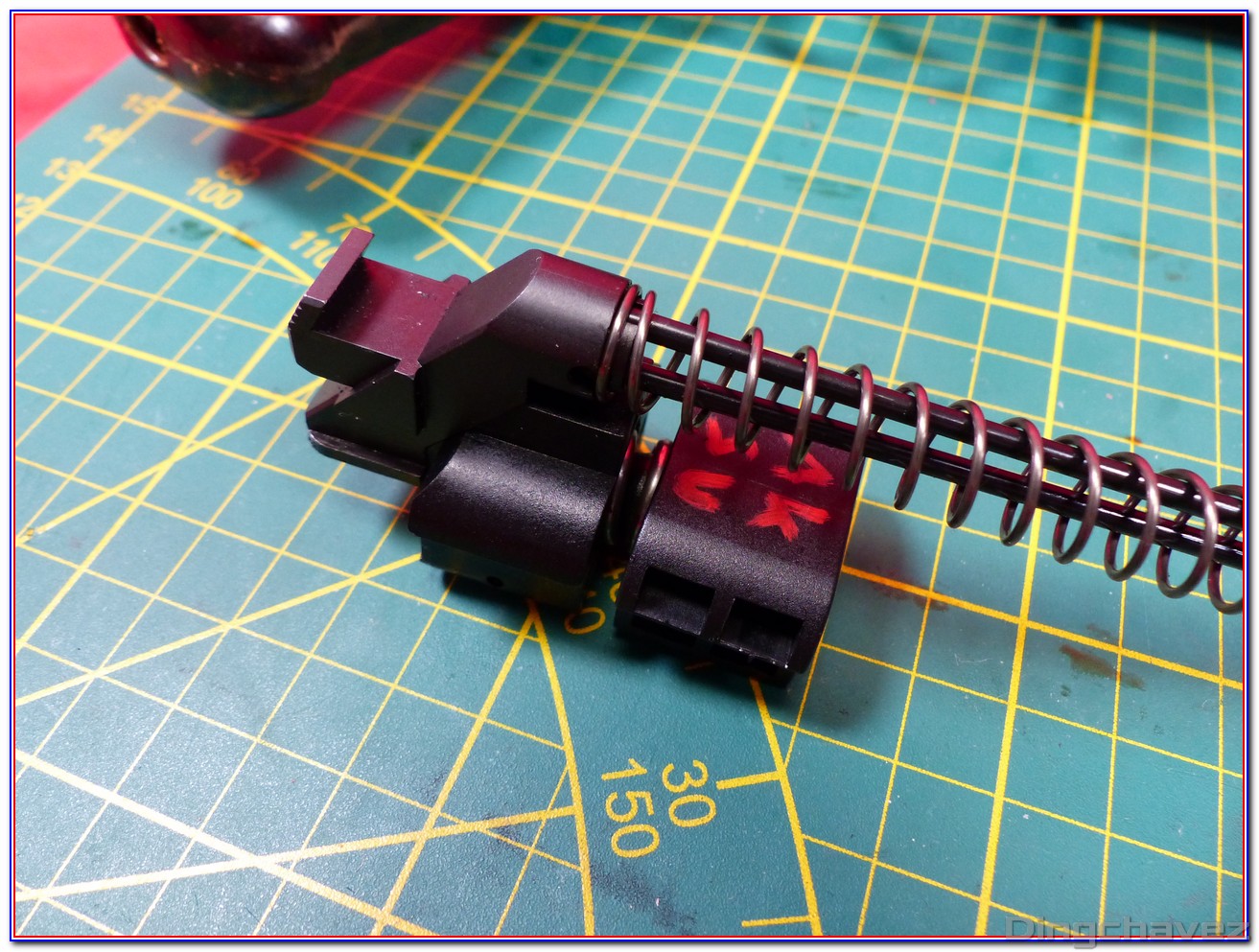 La plaquette claire située à l’arrière est une extension de percuteur (valve knocker extention). C’est elle qui vient frapper la valve de percussion et permet de faire cycler la réplique.