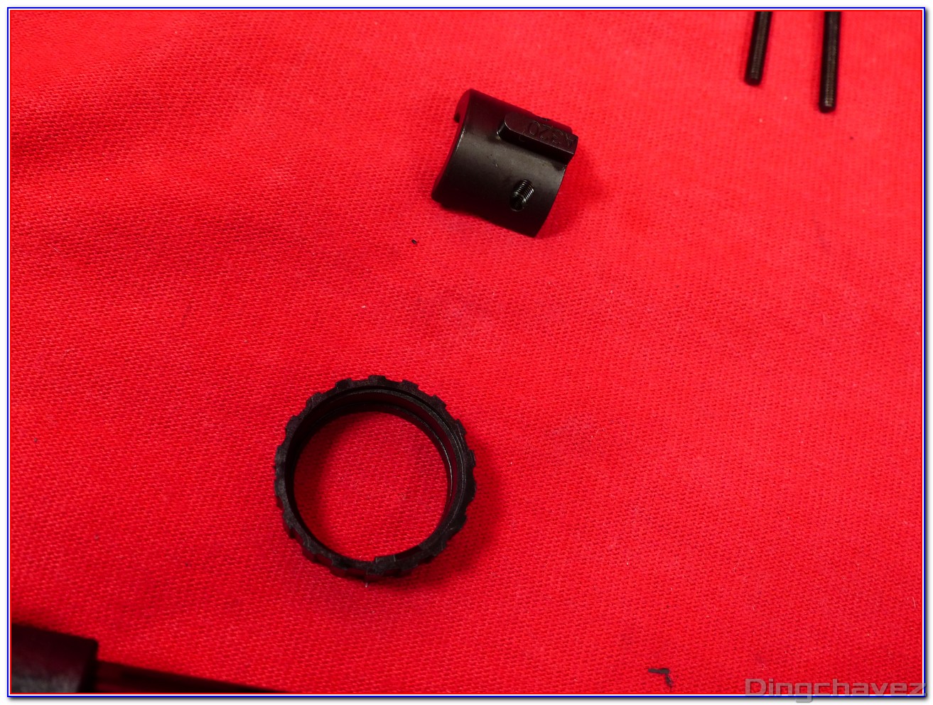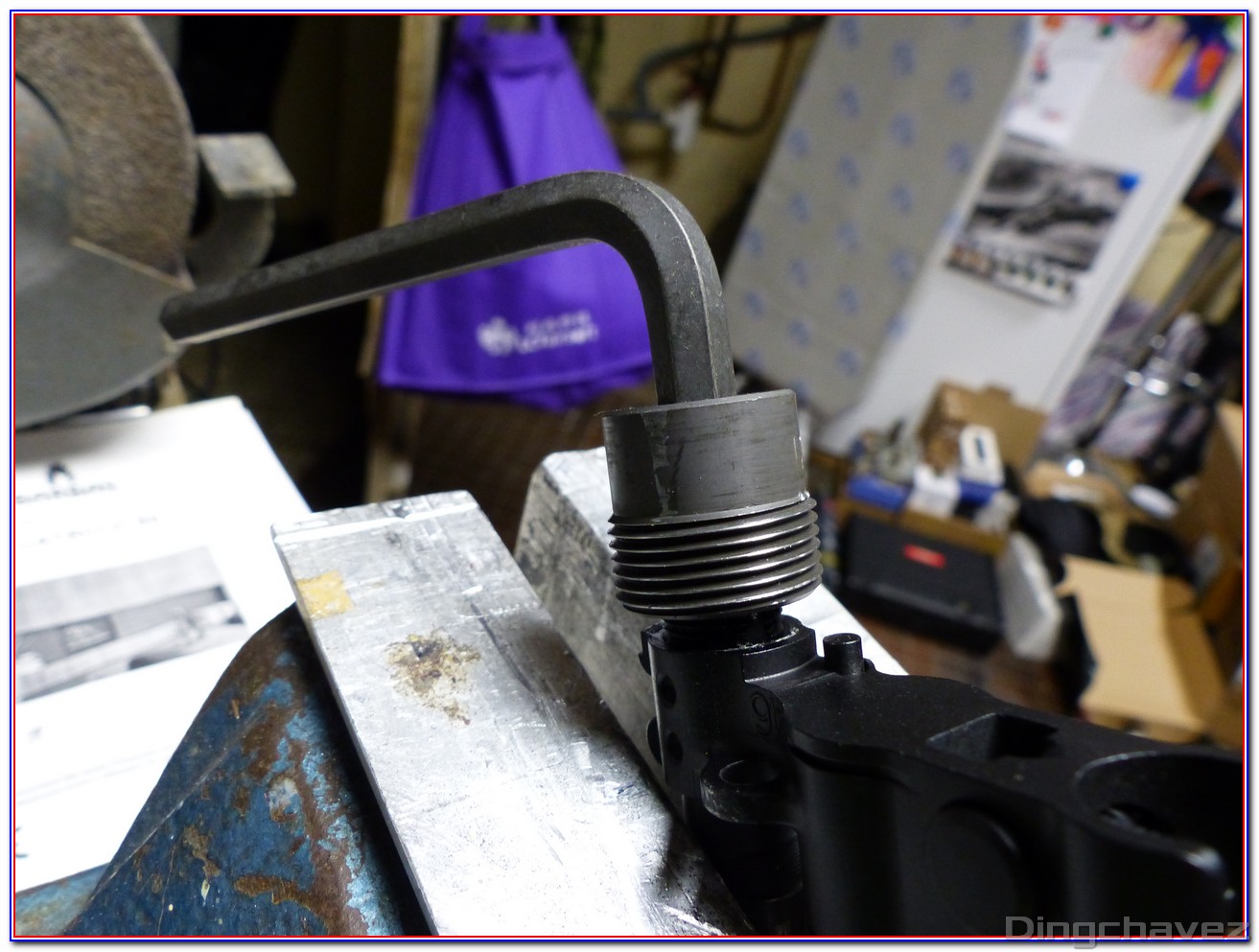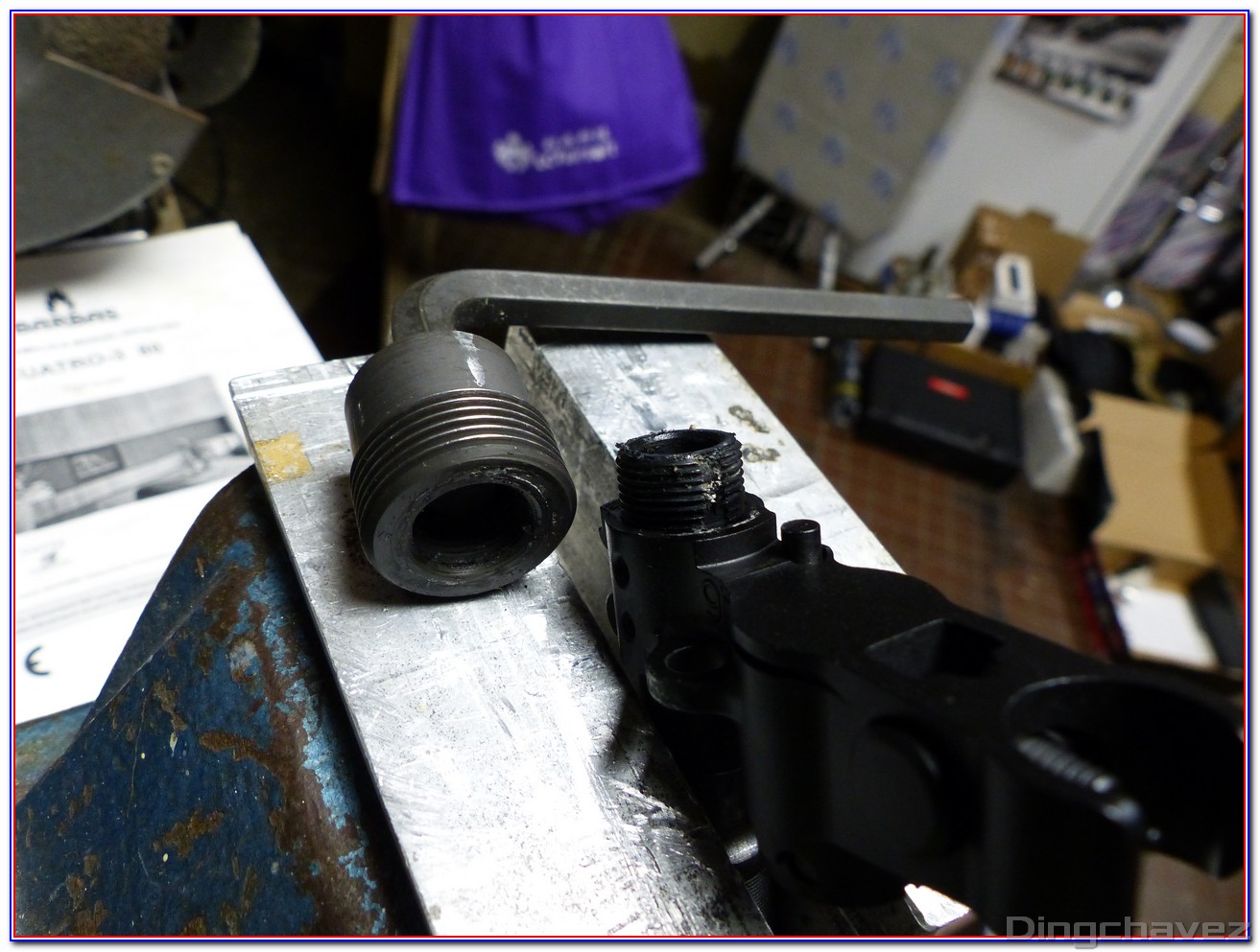 Je termine par le démontage de la bague filetée de 22mm CW. Sur ma réplique elle était très serrée et montée au frein-filet. J’ai donc profité du fait que le canon interne était déposé pour utiliser une clé Allen et un étau pour dévisser la bague.
