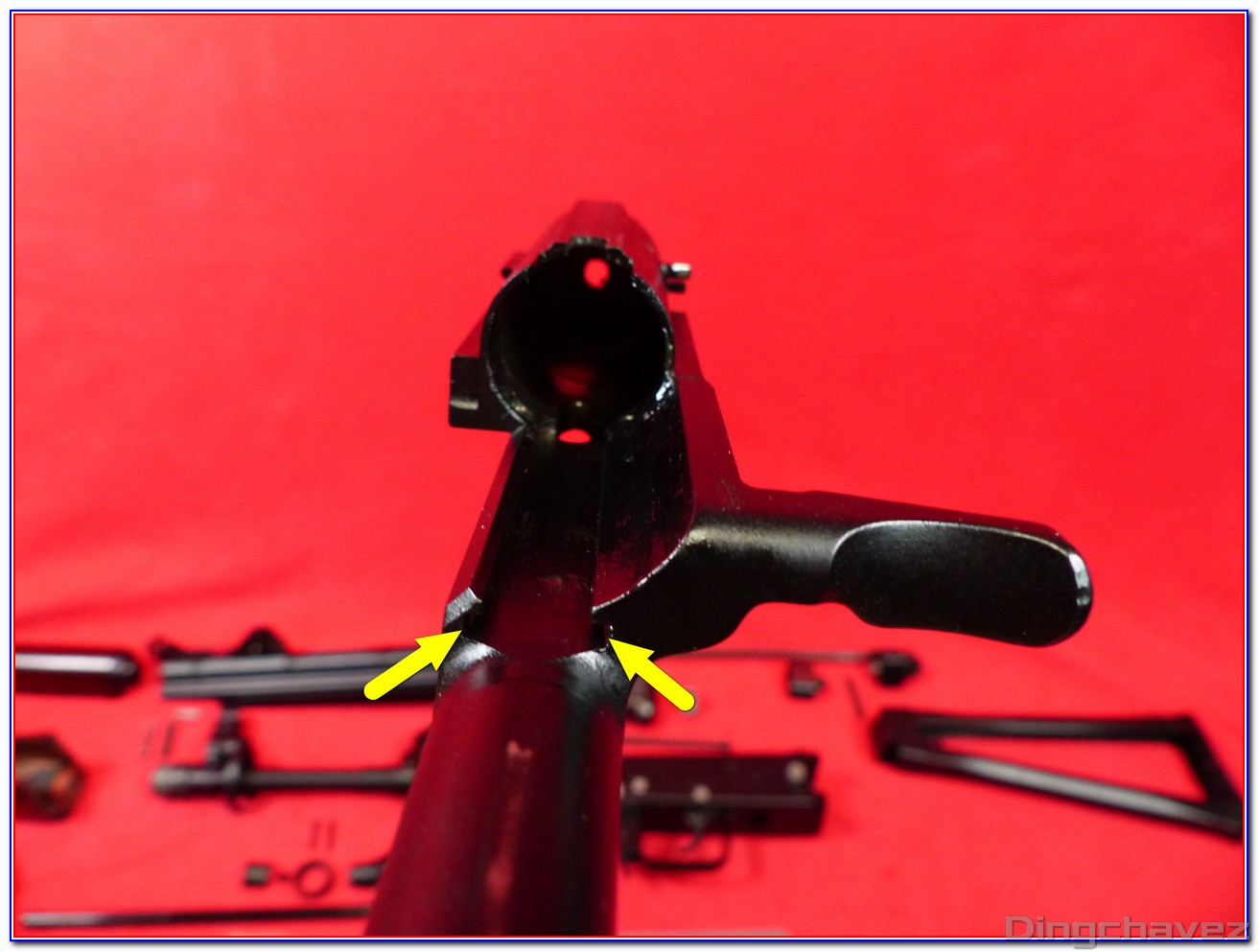 Ci-dessous j’ai repéré les méplats de verrouillage du canon l’arrête qui vient se placer dans la rainure du canon et les picots de maintien dans le bloc.